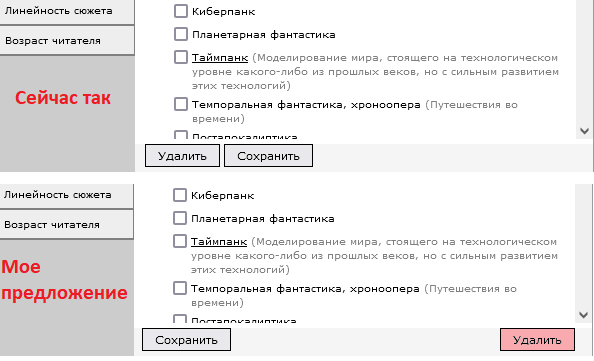 В классификаторе, при нажатии на "Переголосовать" не так давно появилась кнопка "Удалить". Она расположена слева от кнопки "Сохранить", что интуитивно неправильно. Лично я на автомате жму "Удалить". Пока спасает всплывающее окно подтверждения. Предлагаю "Сохранить" переместить левее, а "Удалить" вправо и, может быть, выделить цветом.