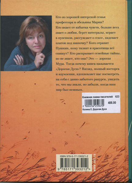 Елена Колина Дорогая Дуся [Мальчики да девочки. Проза Елены Колиной] Оформление переплёта — Е. Ферез. Иллюстрация на переплёте — Евгения Двоскина. М.: АСТ, 2021. 288 с. Пер. 76X108/32 2500 экз. 5-17-139321-2 цитата Кто из хорошей питерской семьи профессора и обезьяны Марии? Кто икает от избытка чувств, больше всех знает о любви, берет интегралы, играет в пупсиков, рассуждает о сексе, надевает платок под шапочку? Кого отравит Пушкин, кому талант и красотища всё спишут? Кто раскрывает семейные тайны, но не знает, кто она? Это — дорогая Мура. Тогда почему книга называется "Дорогая Дуся"? Взгляд, полный восторга и изумления, вдохновляет нас посмотреть на себя с давно забытого ракурса, увидеть то, что мы знали, но забыли, когда наш мир был нежным.