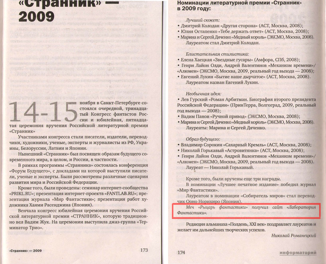 14 ноября 2009 года, в субботу, произошло знаменательное событие — состоялось вручение наград в рамках конгресса «Странник 2009». Примерно в семь часов вечера по московскому времени в ходе торжественного заседания Российского конгресса фантастов «Странник» сайт «Лаборатория Фантастики» получил премию — меч «Рыцарь фантастики»!