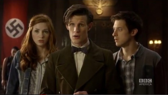 Доктора в цилиндре и с тростью, исполняющего что-то в стиле «антифашистских варьете» в декорациях Рейхстага со свастиками, а также Гитлера, благодарящего Доктора и Ко за спасение (это явно из седьмой серии, «Let's Kill Hitler», сценарий Моффата, премьера — 27 августа вроде как; кстатическая мысль — ни на йоту не сомневаюсь в антифашизме Моффата, но в свете норвежских событий резонанс может быть своеобразным);