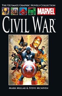 39) «Гражданская война». Внутри: Civil War #1-7, 208 стр. Сценарий — Марк Миллар, рисунок – Стив Макнивен. Закон о регистрации супергероев вносит раскол в ряды супергероев и подталкивает их к кровопролитной войне. Дополнительные материалы: статья о «Гражданской войне», биография художника, галерея вариантных обложек.