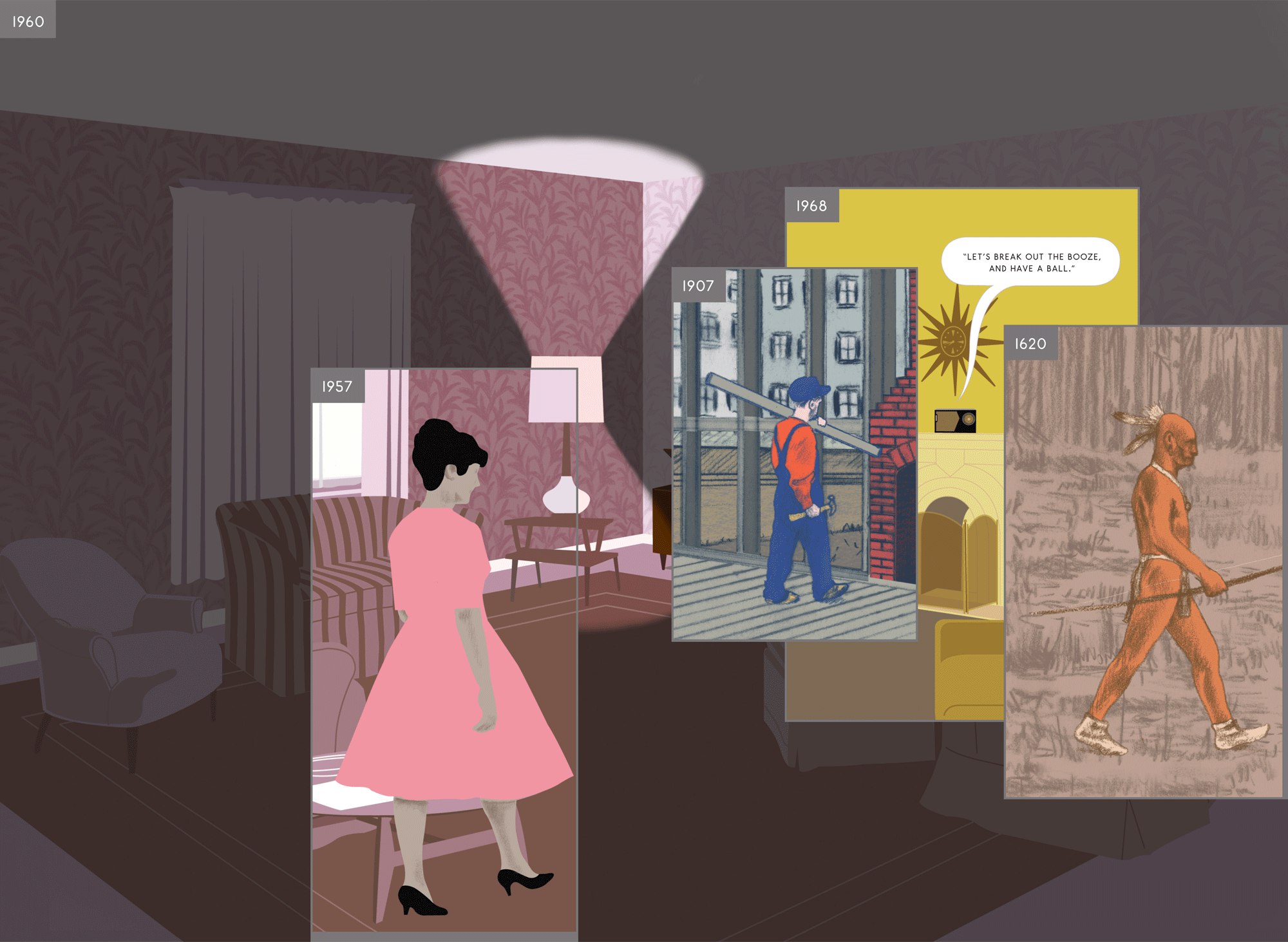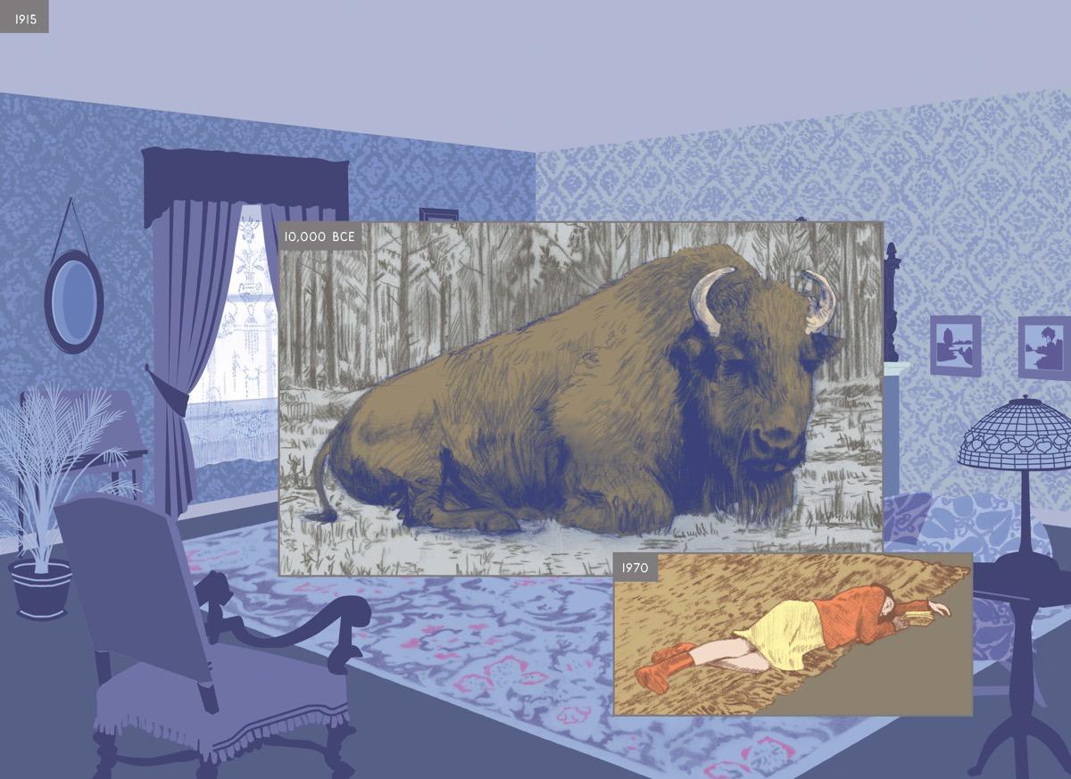 Комикс Ричарда Макгуайра — это история одного места, рассказ о том, что происходило там тысячи, сотни, десятки лет назад, что происходит теперь и как это будет выглядеть в будущем. Динозавры, индейцы, Бенджамен Франклин, пожилые супруги, молодые родители — всех их автор, он же художник, видит как будто одновременно, и угол обычной комнаты в обычном современном доме становится то лесом, то парком, то котлованом на стройке.