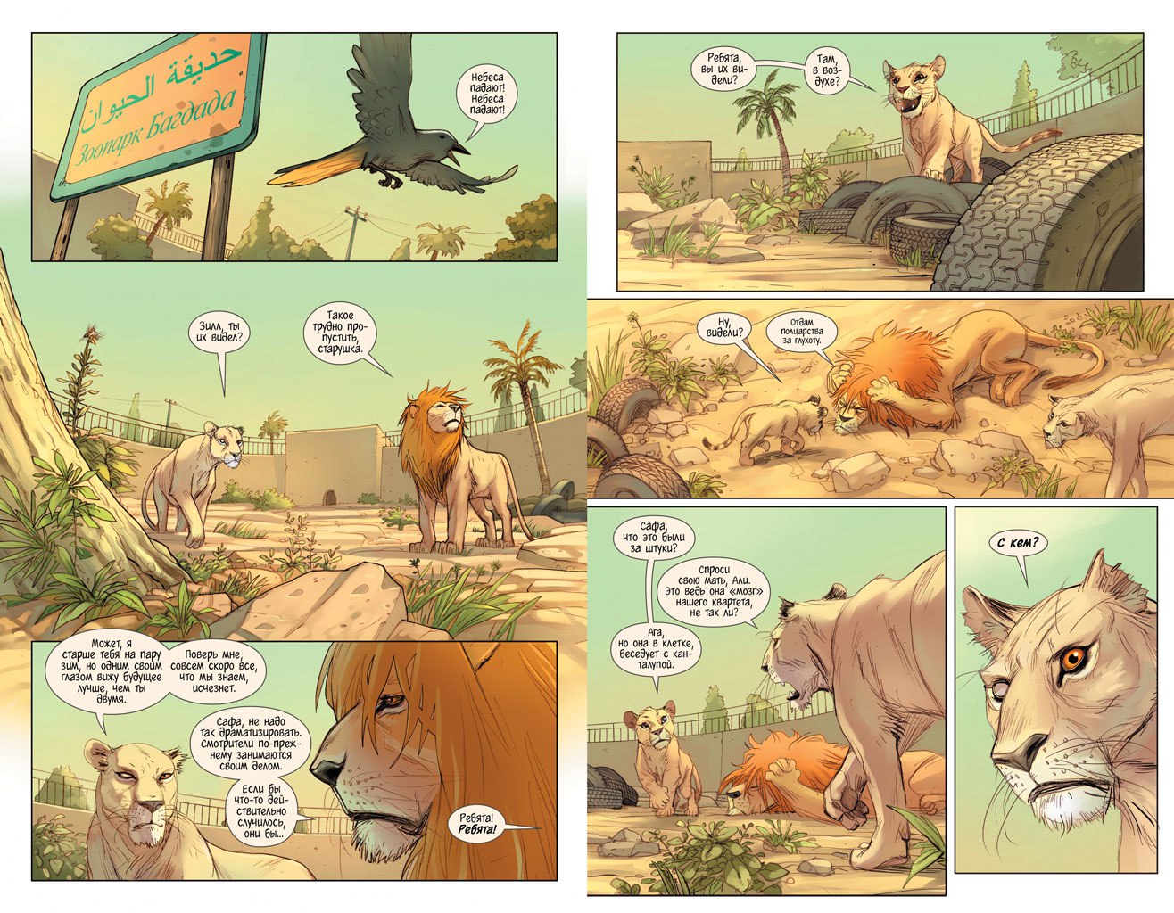 В апреле 2003 года прайд львов выбрался из Багдадского зоопарка во время бомбардировки города американцами. Вдохновленные этими событиями, писатель Брайан К. Вон и художник Нико Анришон открыли необыкновенное окно в жизнь природы во время войны и показали цену выживания на фоне поразительно правдоподобной истории войны в Ираке. Описывая бедствия, свалившиеся на багдадских львов, эта непростая история затрагивает саму суть понятия «свобода». Можно ли получить ее из чужих рук, или ее можно добыть лишь собственными силами и самопожертвованием?