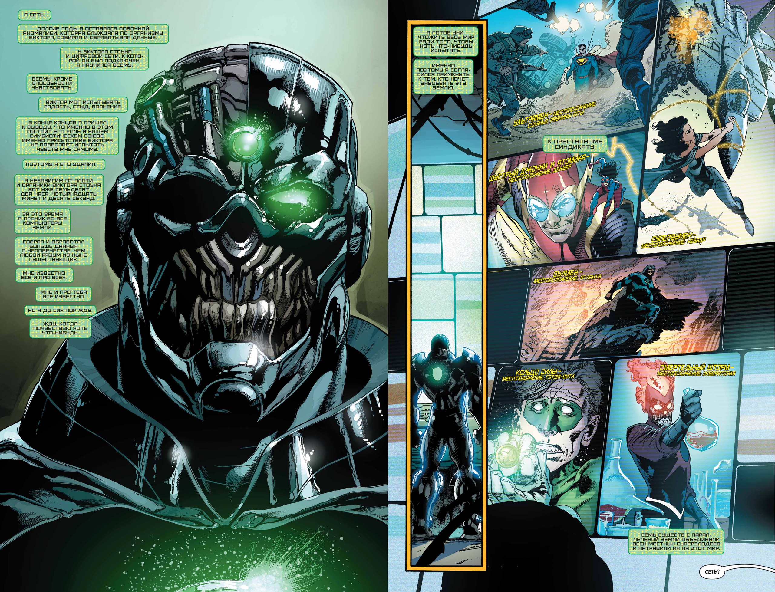 Ультрамен. Оулмен. Супервумен. Вторгшиеся на нашу Землю из разоренной параллельной вселенной, эти беспощадные создания с помощью Тайного Общества суперзлодеев рвутся к мировому господству. Каждый из них — искаженная версия одного из героев Лиги Справедливости, заточенных ныне в огненной тюрьме, и каждый член Преступного Синдиката втайне лелеет собственный план. В этом единственная надежда Лиги и всего человечества.