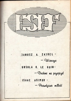 Редакторские амбиции, однако, чаще всего спотыкались на объеме периодического издания. “Kwazar” с его 100 страницами формата А4 мог позволить себе печатать даже романы, но значительно более тонкие “Fikcje” или “Collaps” обречены были на компромиссы. Редакторы катовицского фэнзина пытались разместить на 32 страницах клубную хронику, рассказы, толкинистику, книжные анонсы, библиографию НФ, рецензии, информацию об активных польских фэнах. Раз в год издавался строенный номер с повестью. Таким образом мы познакомились помимо прочего со «Сказкой о тройке» Стругацких, «Direct Descent» Герберта, «Координаты чудес» Шекли.