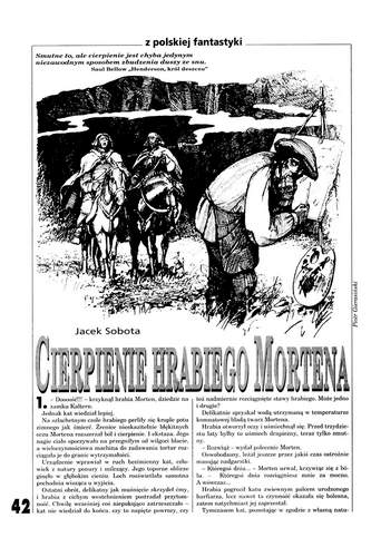 5. В рубрике «Из польской фантастики» напечатан новый рассказ Яцека Соботы/Jacek Sobota “Cierpienie hrabiego Mortеna/Страдание графа Мортена” (стр. 42-47). Иллюстрации ПЕТРА ГЕРАСИНЬСКОГО/Piotr Gierasiński. «Этот умный нигилист и злой насмешник сумел разработать собственную формулу “sobota-fiction”. Свое представление о бескорыстной (потому что абсурдной) жестокости мира он высказывает в сюжетно красочных, эстетически изысканных и изобилующих философскими парадоксами рассказах» (Мацей Паровский).