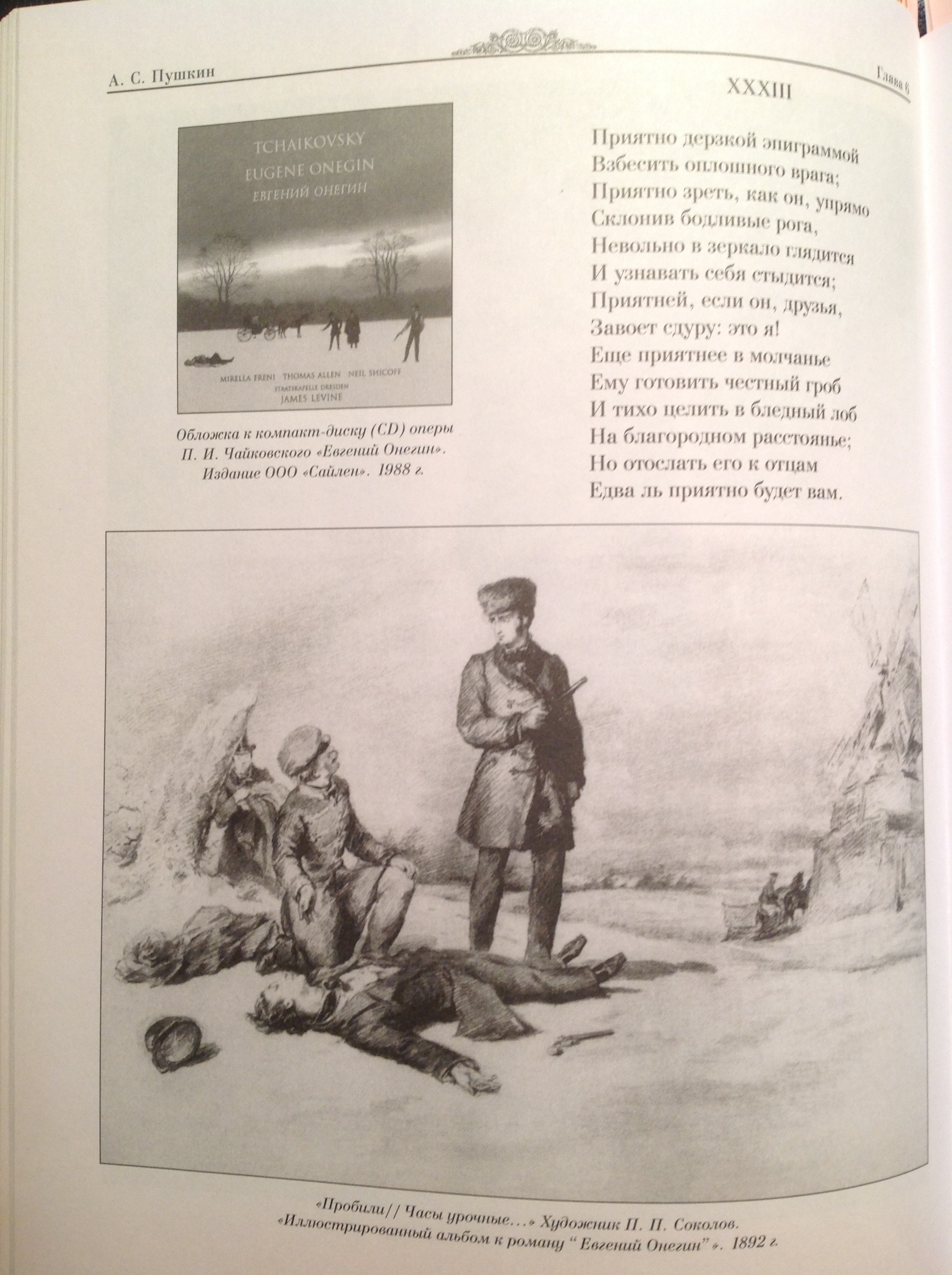 Например, оказывается, что воображаемая сцена с онегинским дядюшкой ("печально подносить лекарство...") — это не находка современных продвинутых постмодернистов, она есть у Соколова. Но у Соколова она изображена в примитивной манере: вот повеса летит на почтовых, вот пыль, а вот в "облачке" то, о чём повеса думал. Позднейший прорыв в книжной графике нужен был, в том числе, и для того, чтобы художники перестали рисовать такое "облачко" ("облачко", как известно, нужно для того, чтобы в него впечатывать речь героя в комиксах).