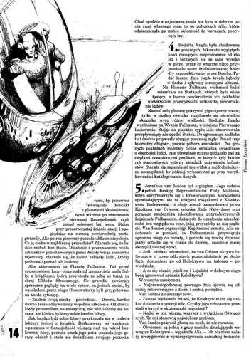 3. Роман американской писательницы Лоис Макмастер Буджолд/Lois McMaster Bujold, который называется в оригинале «Falling Free» (1987, ”Analog”, Dec. и Mid. Dec.; 1988, ”Analog”, Jan. и Feb.), перевела на польский язык под названием «Stan niewolności» АННА ДОРОТА КАМИНЬСКАЯ/Anna Dorota Kamińska (продолжение, стр. 25-41). В номере журнала публикуется пятый фрагмент перевода. Иллюстрации АНДЖЕЯ ГЖЕХНИКА/Andrzej Grzechnik.