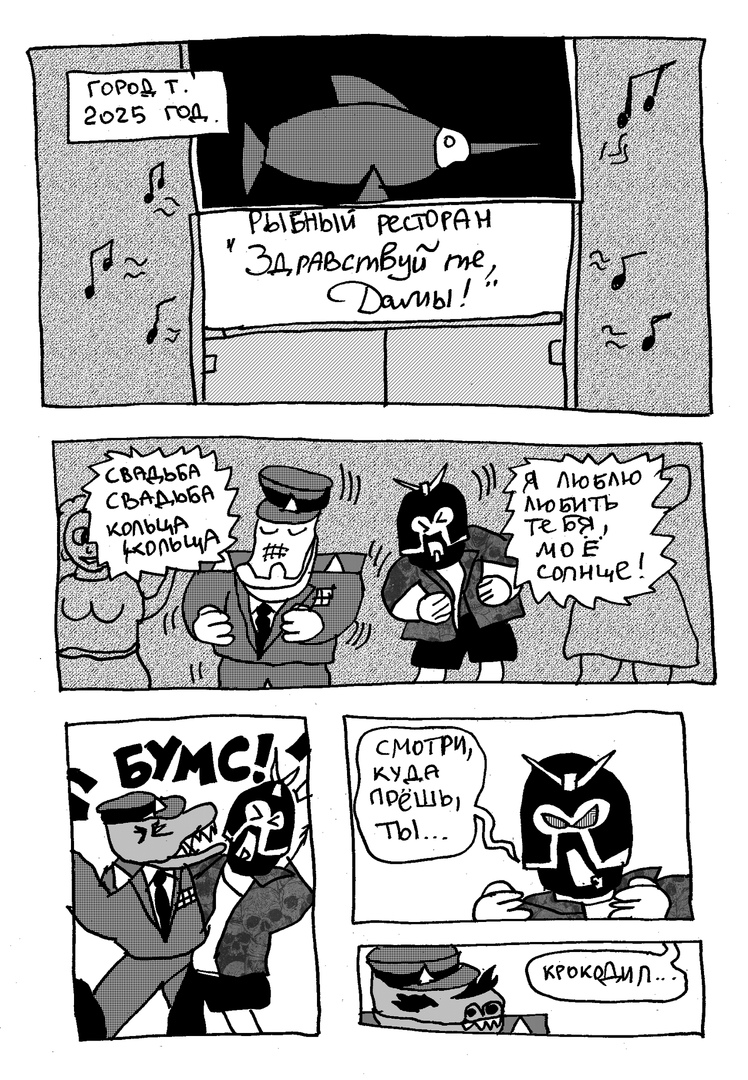 Так вышло, что события комикса Даниила «Моби Би» происходят в 2025 году, а события моего комикса «Русские объединяются с крокодилами и нападают на Европу» в 2026 году. И эта история как раз о том, что делали крокодилы за год до того, как объединились с русскими.