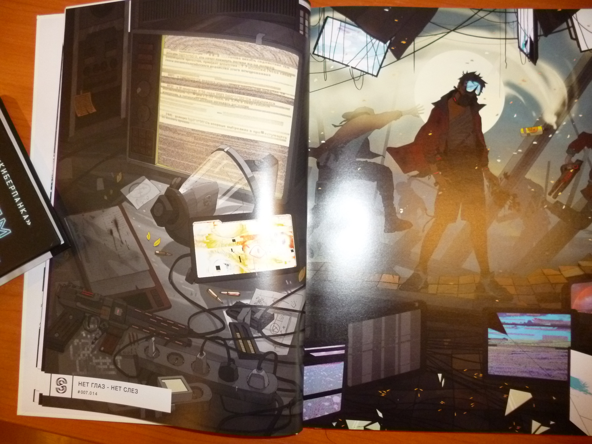В значительной части картин люди на нашей Земле в намордниках, в противогазах, родители детишек за руку держат смотрят на старт ракеты, оба опять же в химзащите, кругом помойки, даже на колонизированной Венере, и ружья нацеленные в людей, а если совсем технологическая ткань общества истлела до средневековья — то и просто биты с дубинками. Не, такого будущего не хочется. Книга имеет знак «18+«, и это если вдуматься ужасная помета времени, если такое будущее, неминуемо и логично вырастающее из текущего настоящего, детям показывать вредно.