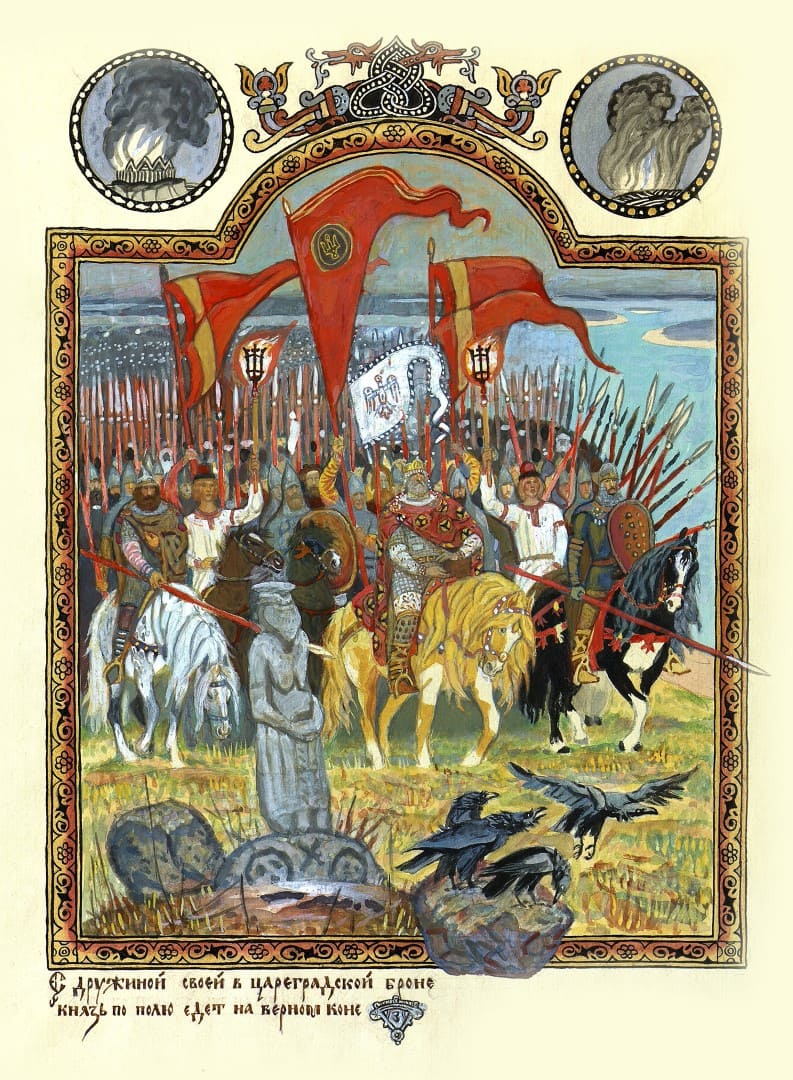 Б) Вариант из издания 2014 года: чуть изменилась композиция — крайний конь справа (вороной) повернул голову к центру. По-прежнему, пожары за рекой и череп коня, но произошло усиление статуса Олега — помимо короны у него ещё и доспехи позолоченные. По поводу этой картинки ув. Кот в сапогах в комментариях высказал мнение, что «картинка просто аллегория — Олег на вершине могущества и череп подле идола, как намёк на скорое падение». И вот рядом третий неопубликованный вариант (многосоставная рамка): голова крайнего коня повёрнута, Олег в короне, но в обычной кольчуге. Над Олегом — белый штандарт. Пожары исчезли — они переместились в розетки и теперь могут трактоваться как видение будущего. Теперь картинка в точности соответствует подписи: «Князь по полю едет на верном коне» (т.е. действие происходит до столкновения с хазарами). И череп коня у подножия идола исчез. В этом варианте сюиты черепов (как намёков для Олега) хватало на самой первой иллюстрации.
