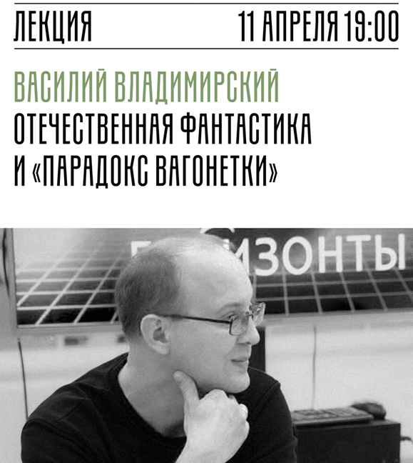 Официальный анонс: 11 апреля в 19.00 на Новой сцене МХТ имени А.П. Чехова (Камергерский пер., д. 3А) состоится лекция литературного критика, исследователя фантастики Василия Владимирского «ОТЕЧЕСТВЕННАЯ ФАНТАСТИКА И "ПАРАДОКС ВАГОНЕТКИ"». Лекция проводится к премьере МХТ имени А.П. Чехова «Далекая Радуга» по повести братьев Стругацких (реж. Андрей Гончаров).