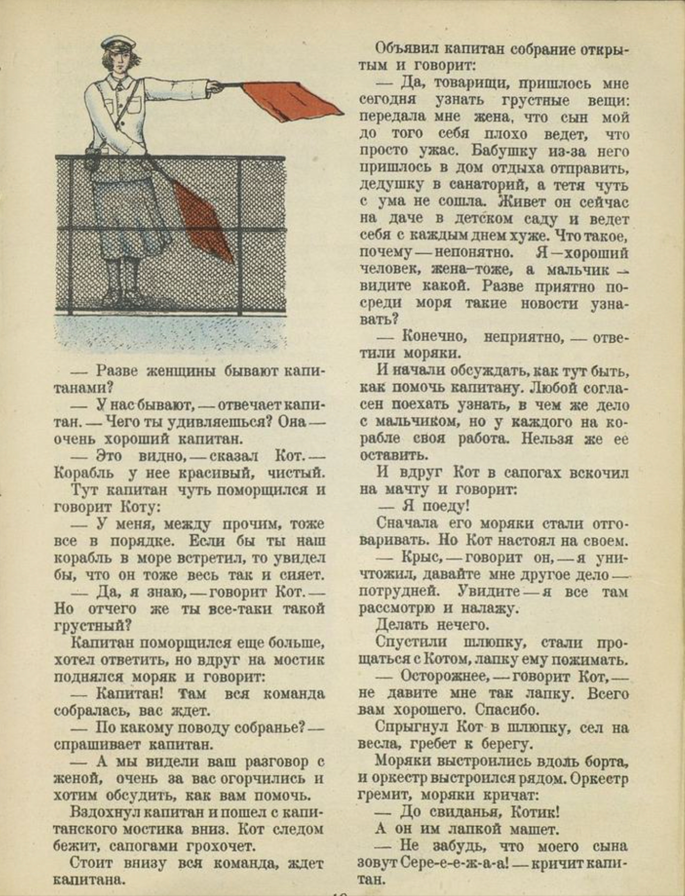 2) Кот устраивается крысоловом на корабль. У капитана есть жена-капитан ("– Разве женщины бывают капитанами? – У нас бывают"). Их корабли встречаются в море. Почему-то ребёнок двух капитанов отбился от рук.