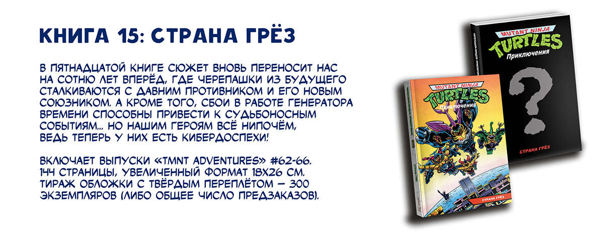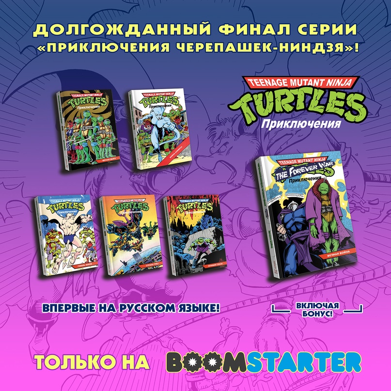 цитатаПриветствуем, друзья! Итак, КОРОТКО: мы запускаем сбор средств на финальный комплект книг, завершающий серию «Приключений Черепашек-Ниндзя» на русском языке, предзаказ которого включает бесплатный БОНУС: ещё одну книгу с легендарным сюжетом «Вечная война»!