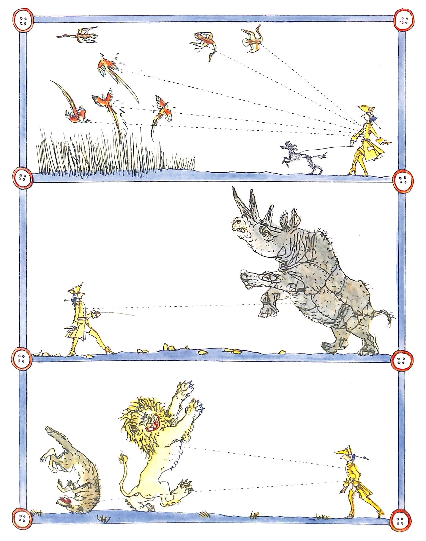 Итак, технические пророчества Чуковского 1920-х гг. Художники, понятно, в большинстве своём изображают момент поражения дичи пуговицами.