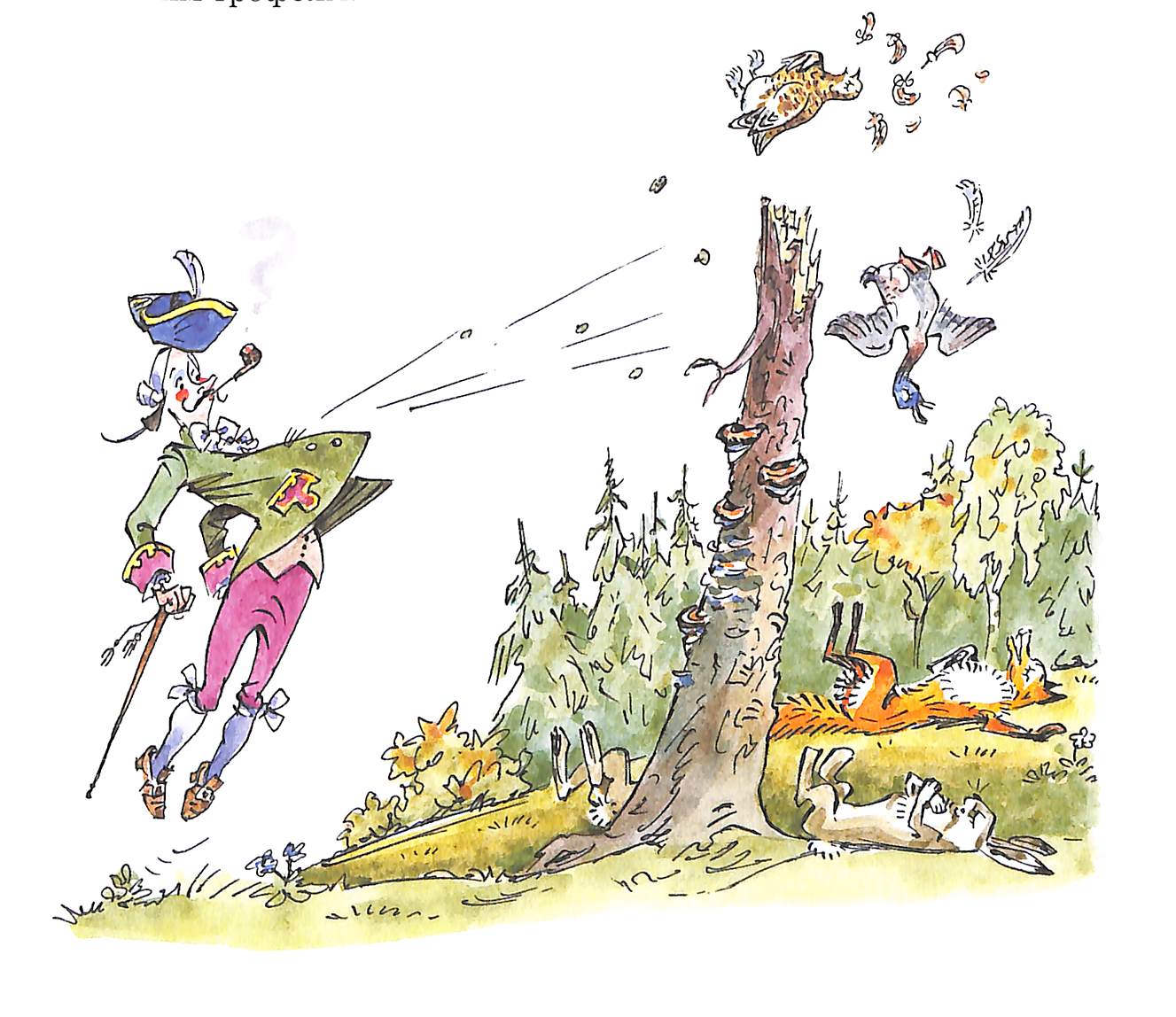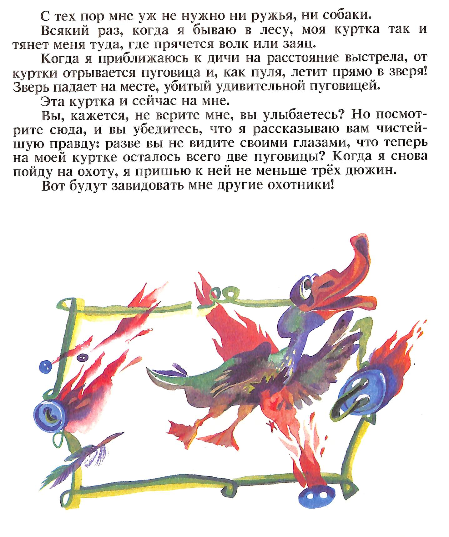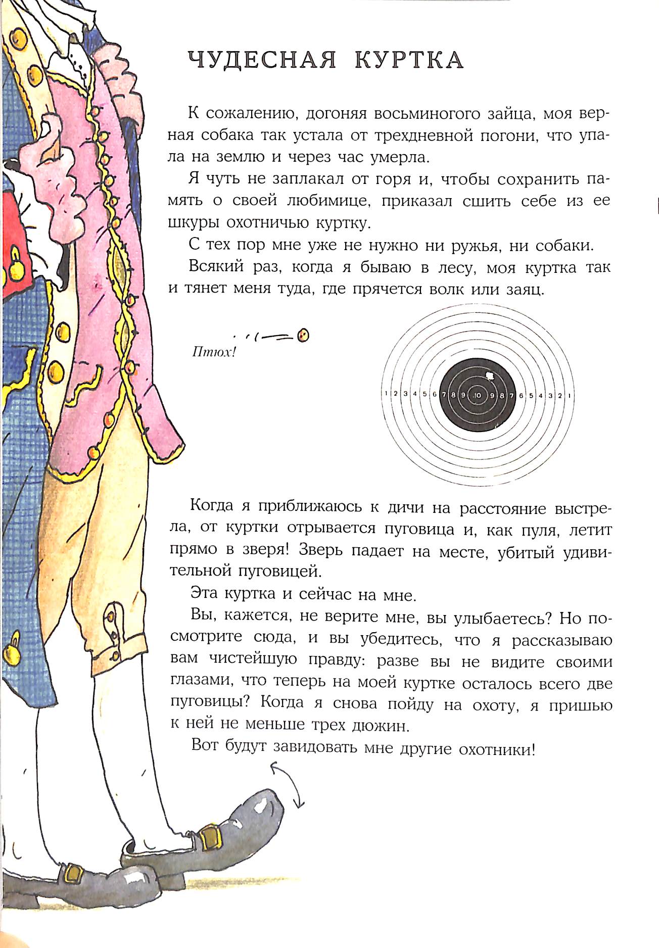 цитатаКогда я приближаюсь к дичи на расстояние выстрела, от куртки отрывается пуговица и, как пуля, летит прямо в зверя! Зверь падает на месте, убитый удивительной пуговицей.