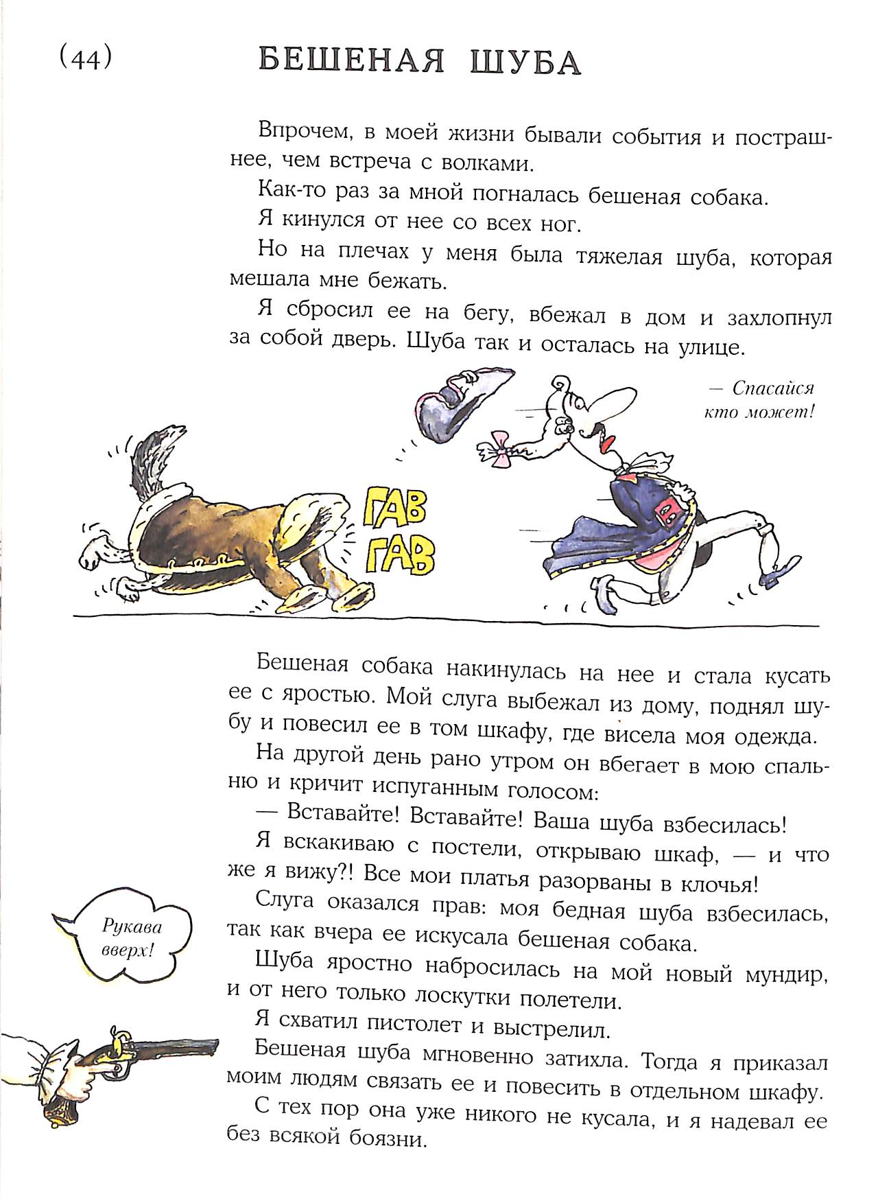 1) Зимой в городе за Мюнхазеном погналась собака, болеющая бешенством. Собака покусала его шубу ("меховой сюртук" в оригинальной версии).