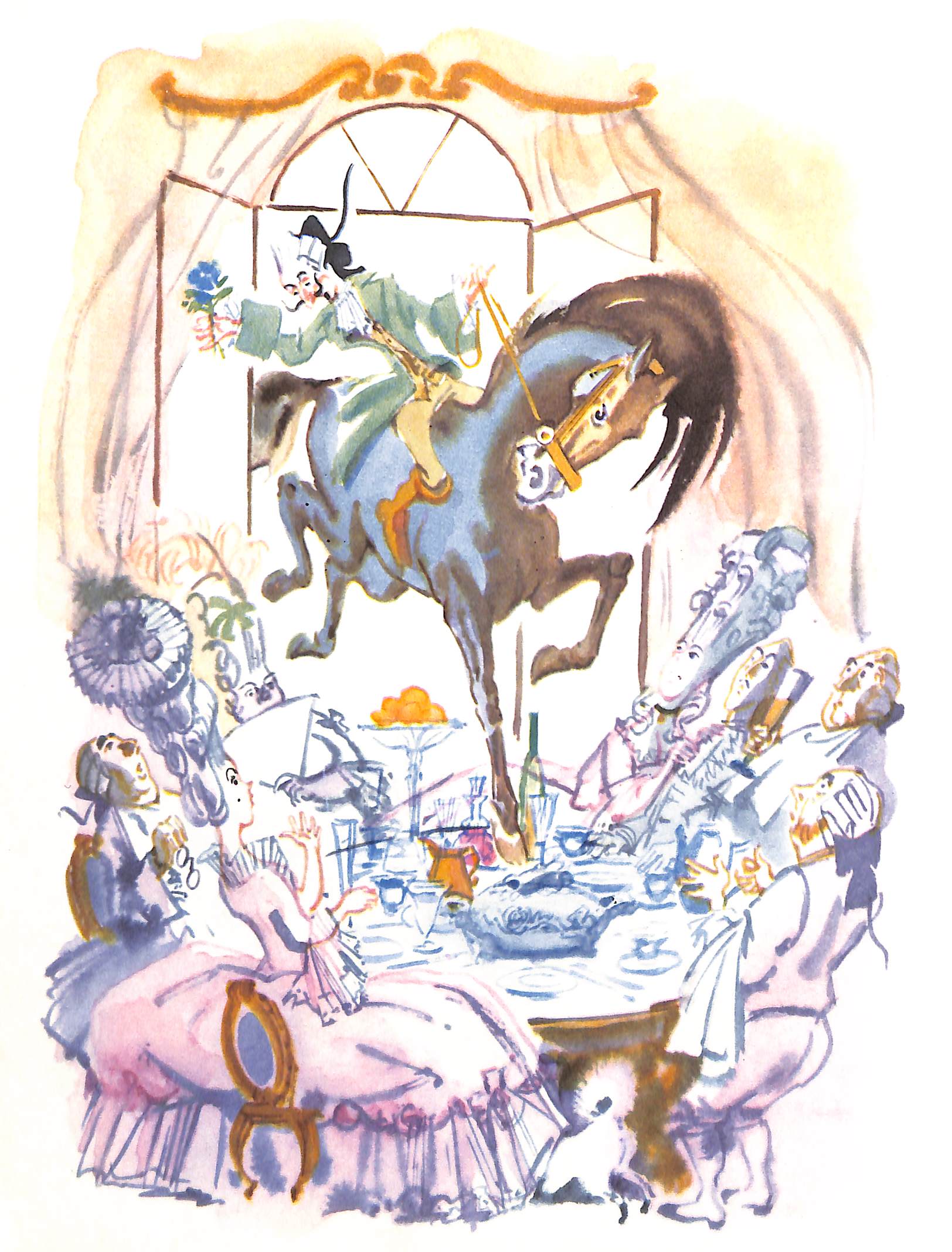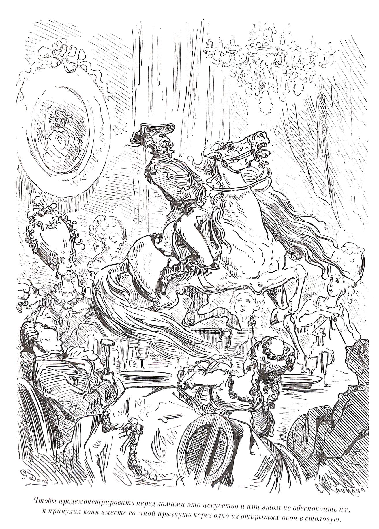 2) Других художников интересует реакция дам на коня, который внезапно оказался у них на столе. Сам-то Мюнхаузен пишет, что вольтижировка на столе вызвала горячие симпатии дам. Не все художники верят в это.