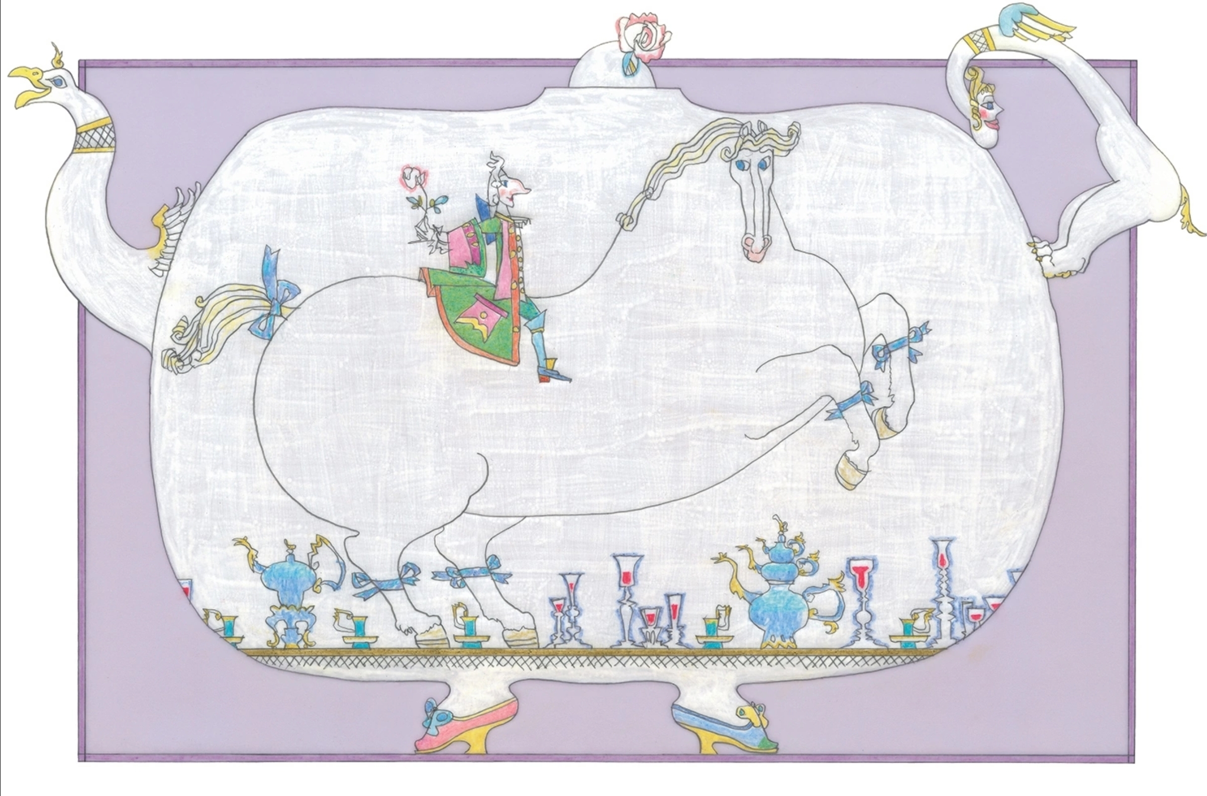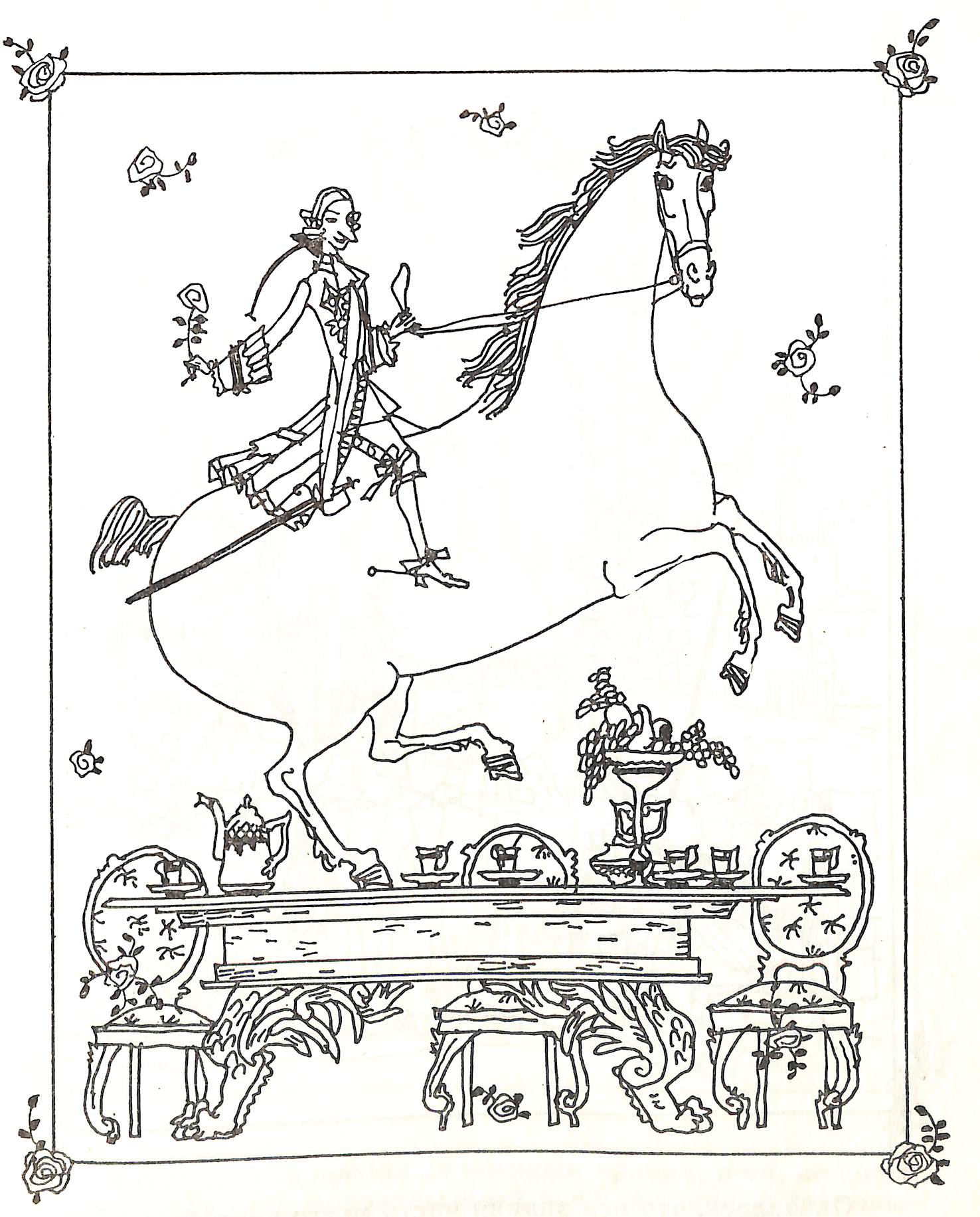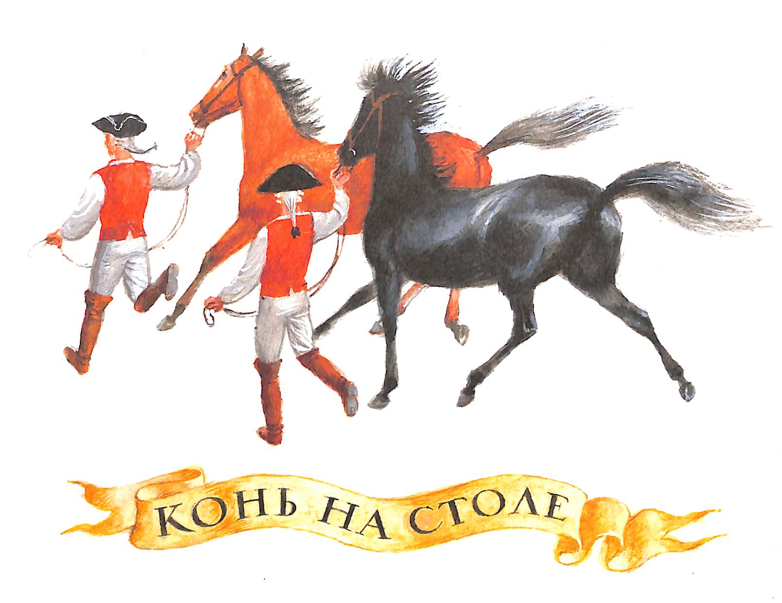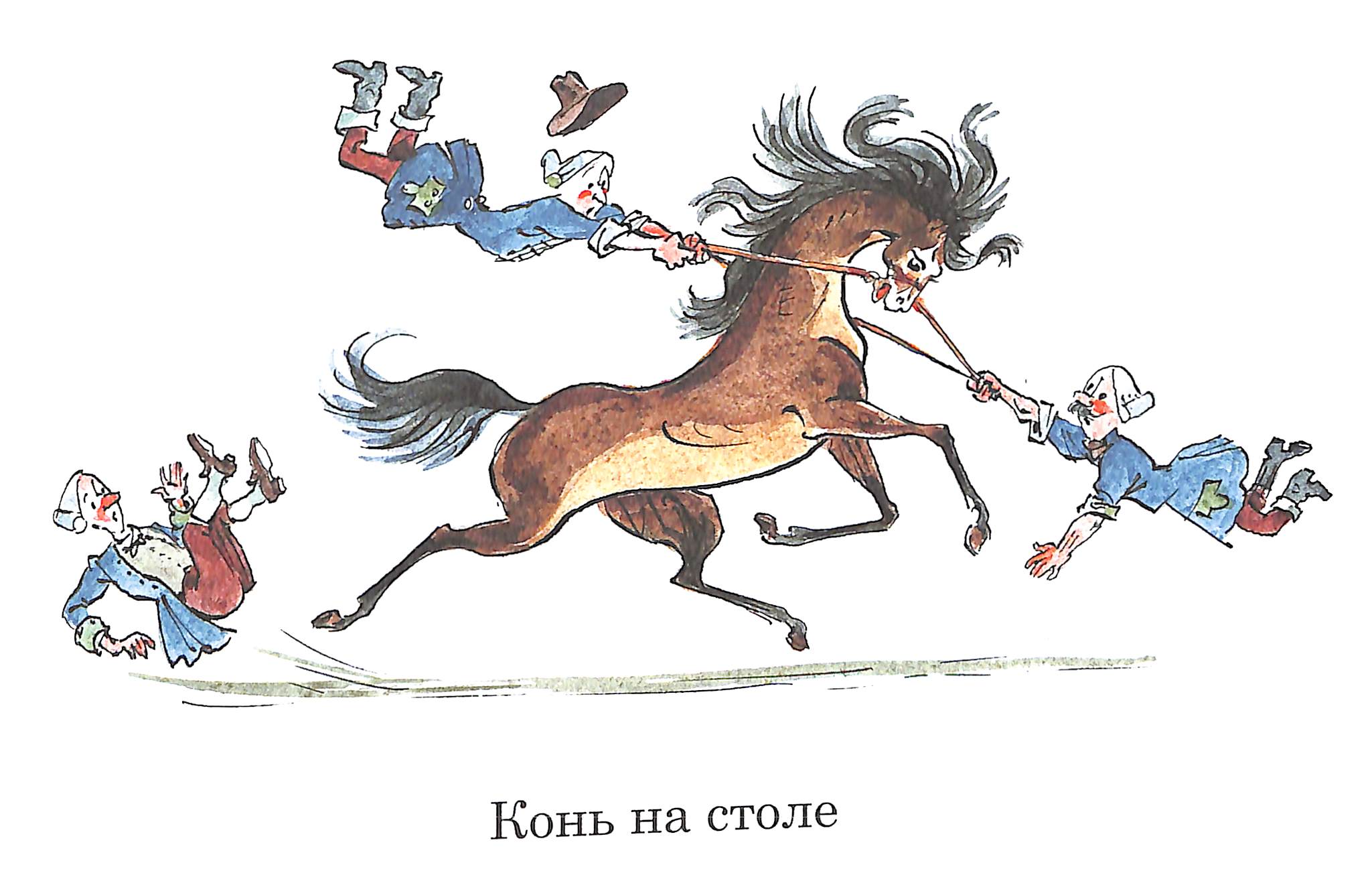 Но есть эпизод укрощения коня. Гиперболизации тут чуть-чуть: конь гарцует на столе, заставленном сервизом, и не разбивает ни одного блюдца. Этот эпизод выглядит милым и правдоподобным. Почти все художники отдали дань этому эпизоду.