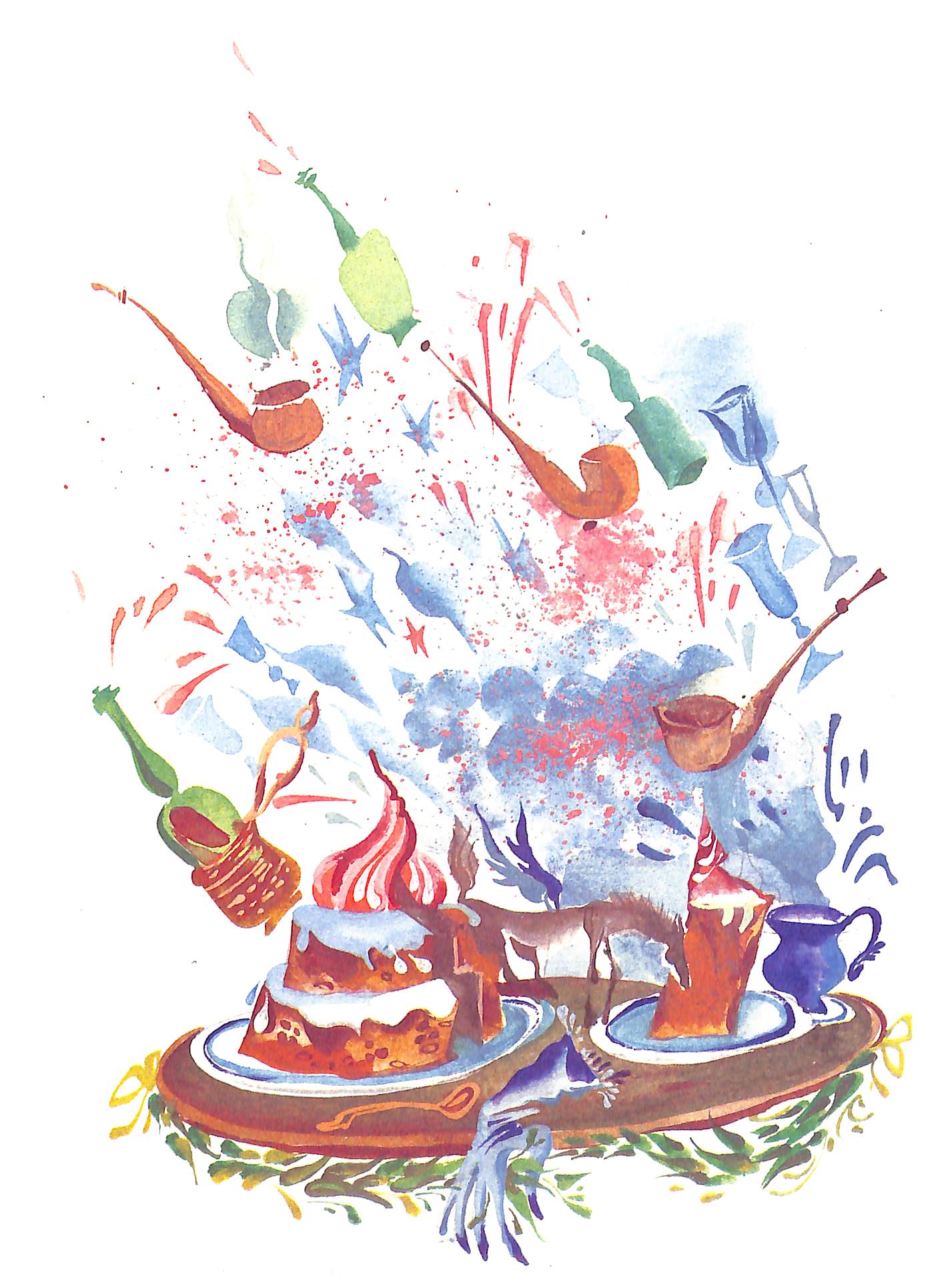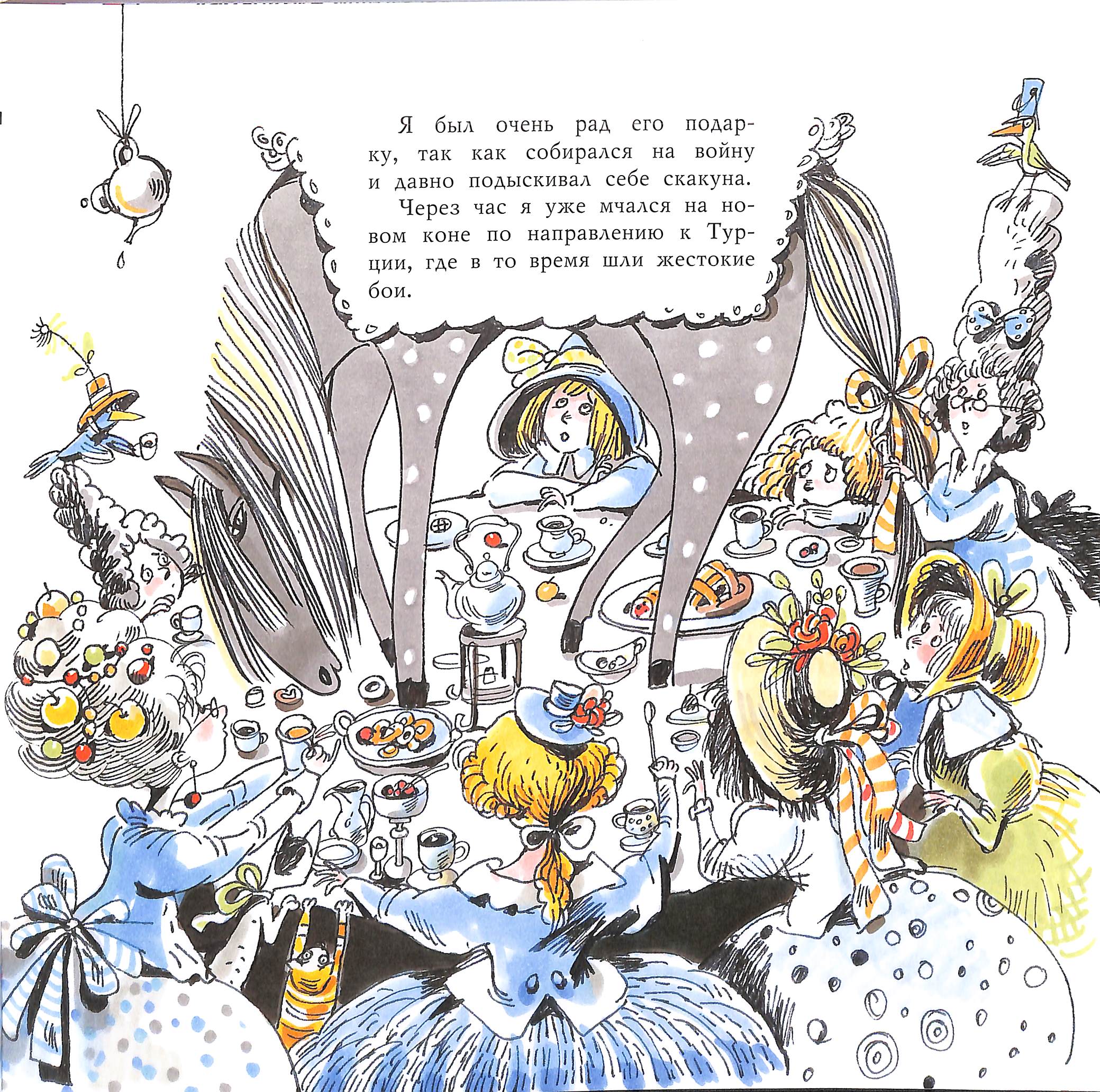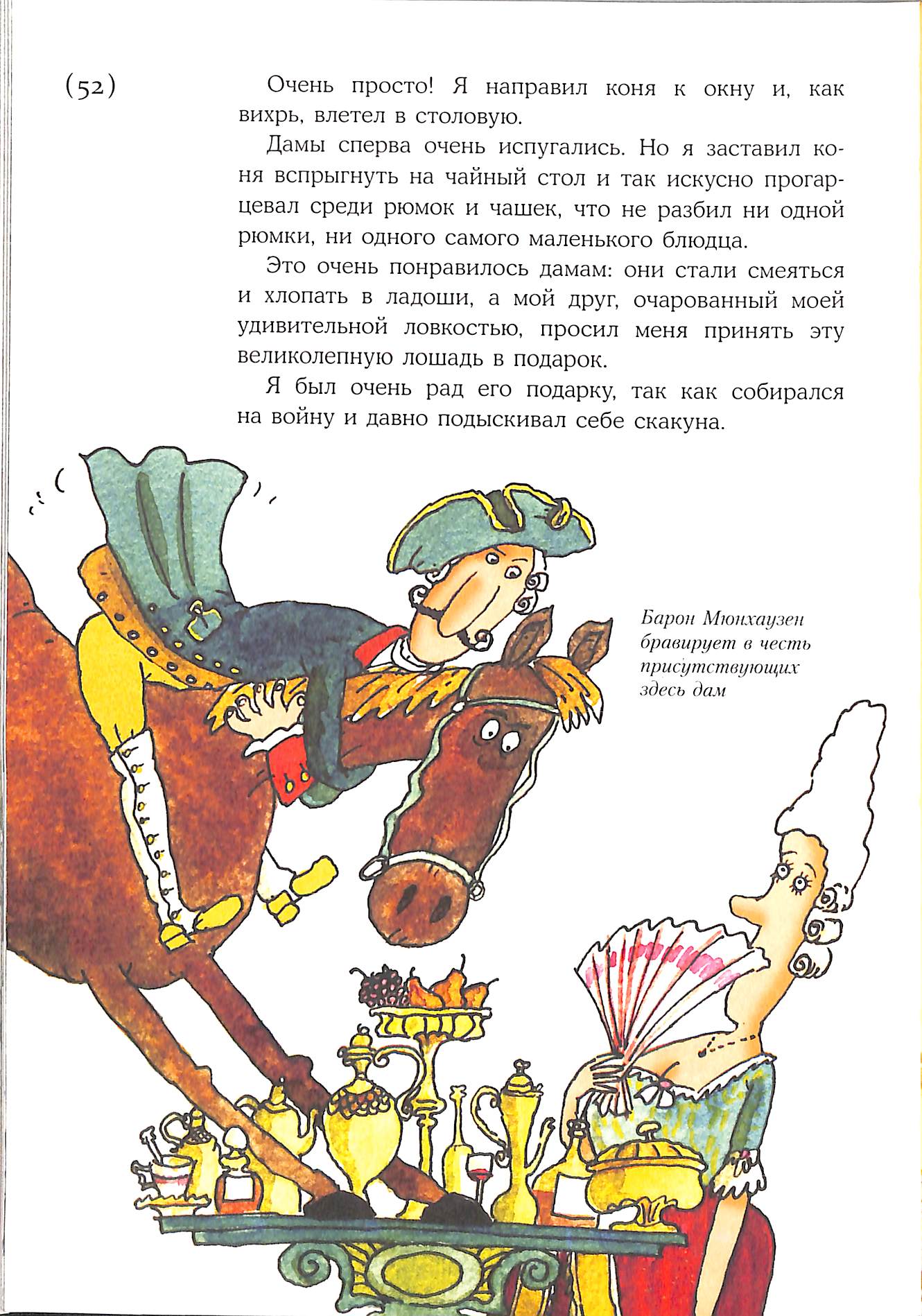 в) В 1971 году "Мюнхаузена" иллюстрировал тандем Скобелев-Елисеев, а в 2014 году — один Елисеев. Испуг дам в раннем варианте. Но это потому, что стол маленький. В позднем варианте Елисеев рисует длинный стол — и эмоции меняются в зависимости от близости потного коня: от испуга до восторга.