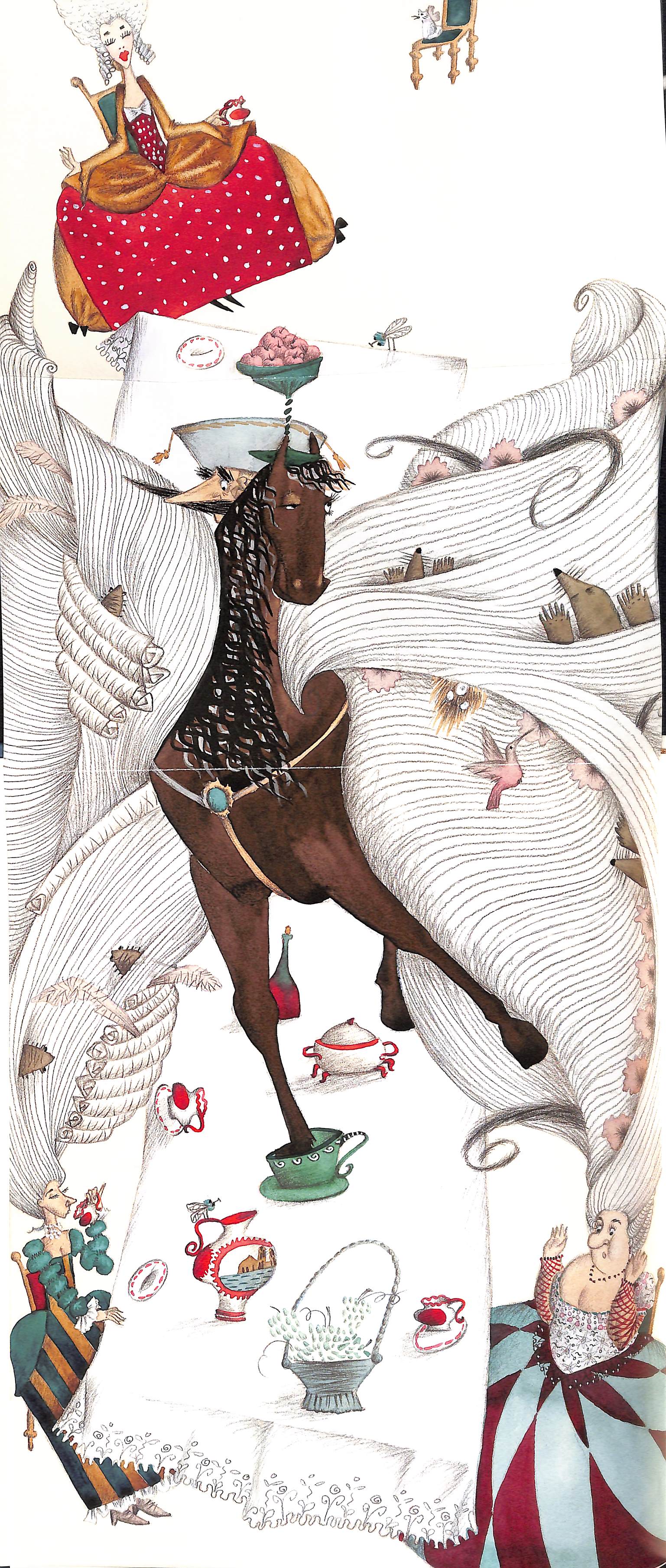 Разложенная страница. Конь таки залез копытом в чашку. Но это потому, что всадник запутался в распущенных женских париках. Мюнхаузен сам испуган: в париках много мелкой живности (это ещё насекомых не видно). И даже мужские усы торчат (и не одна пара) — сами-то бедняги, поди, не смогли выпутаться, да так и померли в парике любимой (хорошо хоть духи тогда сильные были).