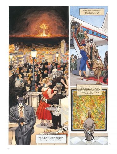 Действие разворачивается на кинематографически разрисованных панелях в ритме песни Эллы Фитцджеральд “Thet Old Black Magic”. Чтению неотступно сопутствует ощущение трехмерности, полнозвучия и движения. Выразительные рисунки и детали на втором плане способствуют тому, что читатель погружается в атмосферу политического преследования. И это еще не все, потому что дополнительного удовольствия доставляет слежение за поп-культурными аллюзиями. Гитлер здесь представляется в виде белого кота (намек на комикс “Maus”), далматинец подается как символ коммунистического лицемерия и ханжества (щелчок по носу Диснею), а Альма Мэйер написала книгу “La Fontaine Today” (поклон духовному руководителю). А из истории получаем Манхэттенский проект и предательство Клауса Фукса и супругов Розенберг.