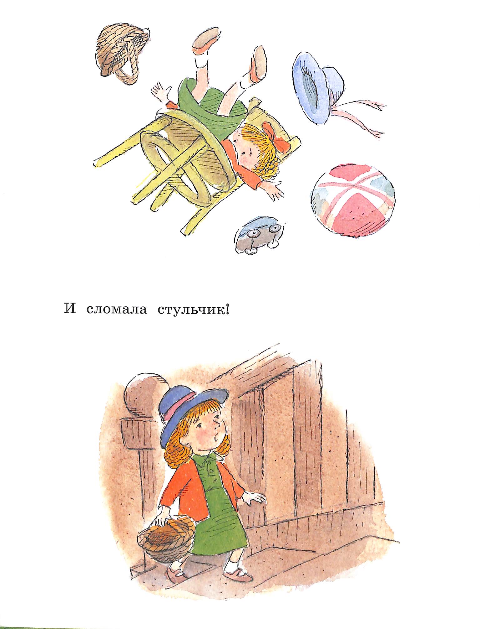 2) Противопоставление персонажей есть и на первом развороте. Медведи на семейном портрете в раме благочинны, а девочка... Неряшливая, заносчивая, одета по-городскому. По типажу напоминает Пеппи-Длинныйчулок, появившейся как раз в это время (1945 год), но в Скандинавии. Неизвестно, насколько такой типаж вызывал умиление в чопорных США в 1948 году. Скорее, Рожанковскому — старому русскому эмигранту, такая девочка виделась вызывающей сожаление.