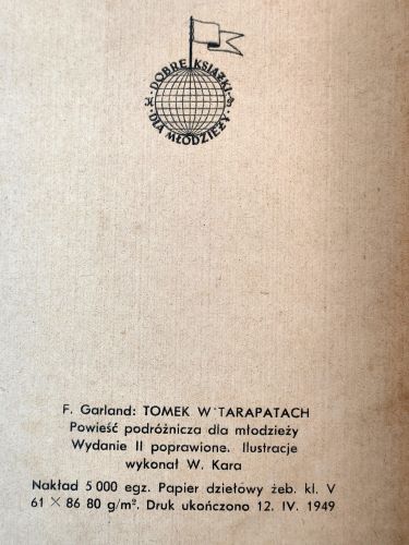А вот эта книга хоть и не входит в канон цикла романов о приключениях Томека Вильмовского и его друзей, является существенным его дополнением. Это роман «Томек в передряге», который был опубликован в 1948 году под псевдонимом Фред Гарланд (Fred Garland “Tomek w tarapatach”). И вот тут я вновь предоставлю слово Джону Ди (John Dee), знакомому читателям этого блога по предыдущим моим постам.