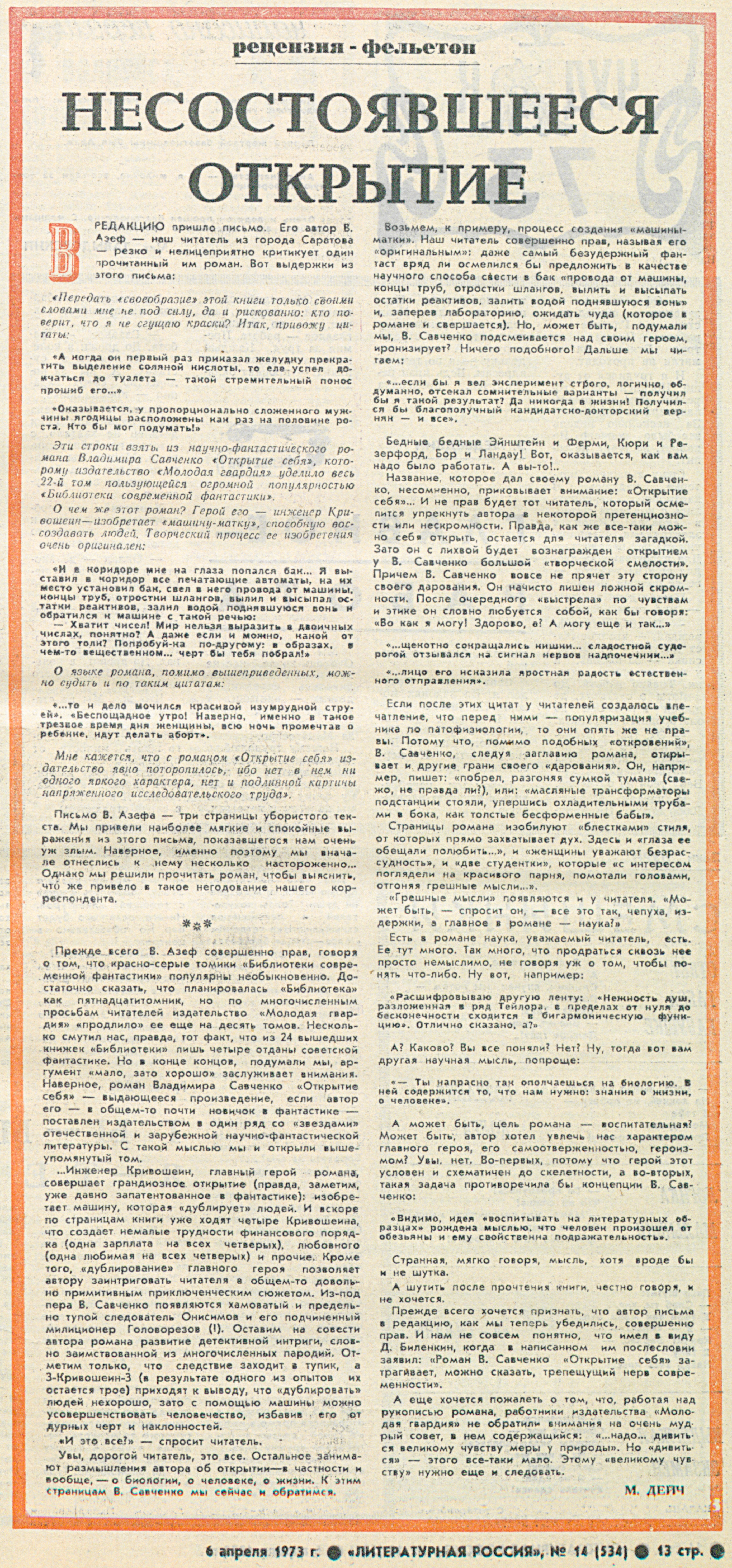 М. Дейч. Несостоявшееся открытие (рецензия-фельетон) // «Литературная Россия», 6 апреля 1973 г., № 14 (534)