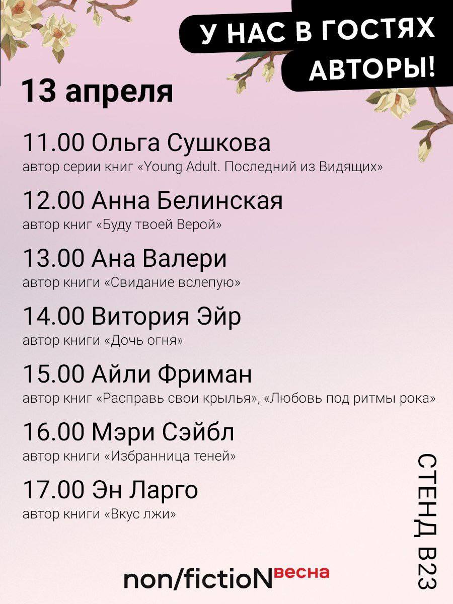 2 и 13 апреля в режиме нон-стоп на стенде В-23 можно познакомиться с авторами, задать им вопрос и получить автограф. Расписание встреч: