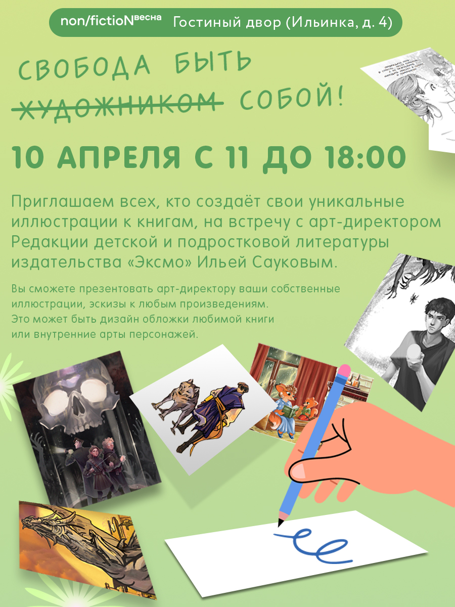 Апрель — не апрель и весна не весна, если не позволить себе окунуться в литературную феерию. С 10 по 13 апреля в Гостином дворе состоится праздник всех поклонников хорошей литературы — книжная ярмарка non/fictio№Весна! Горячие новинки, творческие встречи с авторами, автограф-сессии, мастер-классы, викторины, живое чтение… — и это только часть большой программы, которую подготовили издательства «Эксмодетство» и «Freedom».
