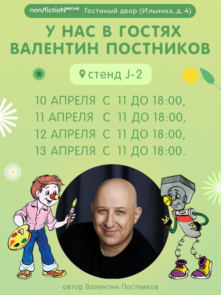 10 апреля с 11:00 до 18:00 в рамках работы стенда J-2 пройдет встреча с арт-директором издательства Ильей Сауковым, а с 10 по 13 апреля — с автором историй о «Карандаше и Самоделкине» Валентином Постниковым.