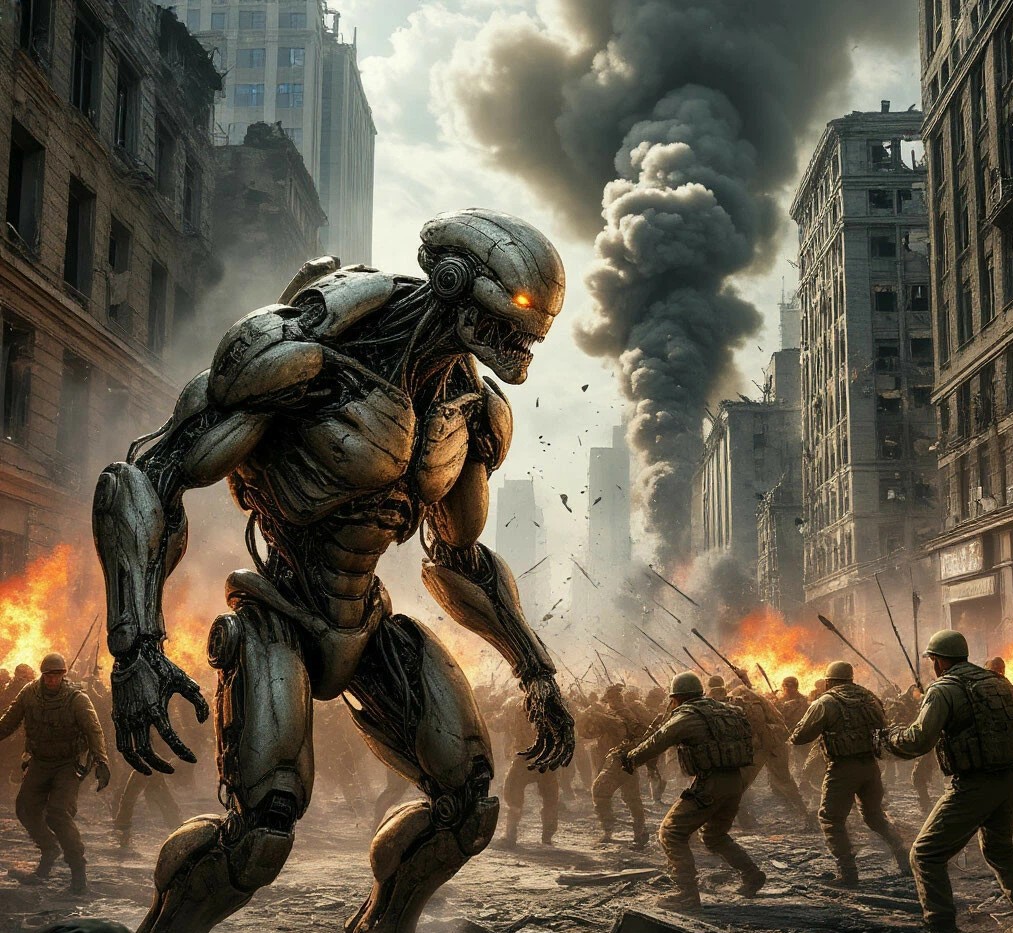 Кое-где люди отстреливались, пытаясь убить незваных гостей. Однако локальные очаги сопротивления подавлялись и людей продолжали убивать. Сверху город обстреливали беспилотные летательные аппараты. Огромный мегаполис горел, и густые чёрные клубы дыма поднимались к небу, стремясь закрыть от выживших, солнечный свет. Слышались выстрелы и стоны раненных, которых добивали чужаки.