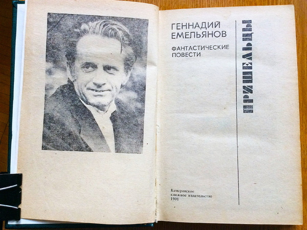 Титульный разворот книги Г. Емельянова "Пришельцы" (1991) с портретом автора.