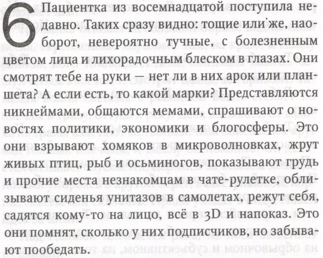 Перспектива такой цены за китайскую дружбу не вызывает в сердце Павла никакого протеста. Во-первых, ему все равно, потому что в Китае, куда он хочет попасть, его так и так чипируют, и тут скорее он мотивирован сделать чипы как можно более качественными. Во-вторых, ему не все равно, потому что поголовная чипизация позволит, как он думает, надежно отслеживать преступников, подобных “Просто Косте” – сыну депутата, 14 лет назад регулярно насиловавшему Павла, пока тот жил в детдоме после исчезновения родителей. Тогда, в середине 30-х, Павлу удалось добиться суда над руководством детдома, сдававшим детей как проституток педофилам, а вот “Просто Костя” вышел сухим из воды. Случайно узнав его в руководителе благотворительного фонда “Добродел”, занимающегося помощью детским домам, Павел понимает, что мечта мечтой, а сухим “Просто Костя” больше ходить не должен. Так все и сцепляется: Павел старается выполнить проект, который откроет ему дорогу в центральный офис “Диюя” в Пекине, но постепенно увлекается слежкой за “Просто Костей” и попытками поймать его за руку на педофилии; у Игоря тем временем готовится отжать здание кофейни застройщик со связями, а Соня попадается на сотрудничестве с “Контранетом”. Это все не спойлеры, а исключительно экспозиция романа, расстановка фигур на доске, по которой далее они будут двигаться в балансе между собственными внутренними правилами и правилами российской жизни, оставшимися в 2049 год теми же, что и сейчас. В итоге формально футуристический роман (более продвинутые технологии, более продвинутые психические болезни) оказывается романом актуальным, использующим фантастическое допущение “Россия попала под влияние Китая” и перенос действия на 30 лет вперед только для того, чтобы показать нынешнюю российскую жизнь с позиции легкого остранения.