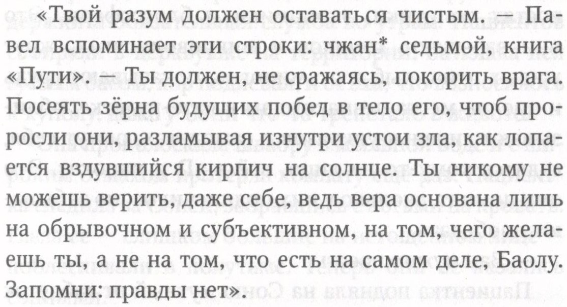 Дальше будет реконструкция событий, которые на самом деле происходили в романе. Читать только тем, кто уже прочел и хочет сверить выводы, и тем, кто решил, что не будет читать. скрытый текст (кликните по нему, чтобы увидеть) Итак, в 2021 году в Россию прямо перед кризисом приезжает один из ключевых членов китайской террористической организации "Контранет" Чжан Шэнъюань. Он скрывается от китайских властей и уходит на дно в деревне под Коломной. Там он начинает строить российскую версию "Контранета", в качестве ключа шифрования используя книгу "Путь ясного разума". Семью он заводит сначала для отвода глаз, а затем, когда рождается сын Павел, понимает, что может сделать из него живое оружие. Шэнъюань воспитывает, по сути, программирует сына как преодолевающего любые преграды воина справедливости, мечтающего поехать в волшебный Китай, и прививает ему интерес к IT. Незадолго до раскрытия он передает "Путь ясного разума", где записан план Павла, ученикам из российского "Контранета", чтобы те вели его дальше. Шэнъюаня экстрадируют в Китай, мать Павла, узнав в какой-то момент, кем был ее муж, в состоянии аффекта решает покончить с собой и убить сына, однако здесь впервые срабатывает программа Павла, в нем просыпается вторая, пока безымянная личность-выживатель. "Контранет" наблюдает за его злоключениями в детдоме, но не вмешивается – программа, оформившаяся в Павле в Шваль, должна развиваться и самообучаться – но сливает в сеть запись суда, чтобы усилить желание Павла жить максимально незаметно. В "Диюй" он также устраивается при содействии "Контранета". Павел едва не срывает план, когда случайно наталкивается на Краснова, но "Контранет" продолжает за ним следить и при необходимости прикрывать. Краснов, кстати, становится случайной жертвой программы – это такой пессимистический момент романа, что ломать зло могут только единицы с весьма и весьма специфическим мышлением. План приводится в исполнение, когда Павел, единственный способный взломать новые чипы человек, уезжает в Китай с "Путем ясного разума" в чемодане. Сопровождающий его член "Контранета" побуждает Павла узнать правду о чипах и своем отце, и тем самым засветиться перед китайскими спецслужбами. После очередного теракта его проверяют, находят "Путь ясного разума" и допрашивают до посинения. Программа в Павле запускает последний цикл "не себя топить, а тех, кто это заслужил", он идет на сделку со следствием, выходит на свободу и уничтожает все чипы в Китае. План исполнен. Кончает ли он с собой после этого, потому что больше ему нечем жить, или возглавляет "Контранет"? Неизвестно. Но понятно, что жизнь Павел прожил не свою и считай что так и остался на речном дне вместе с матерью.