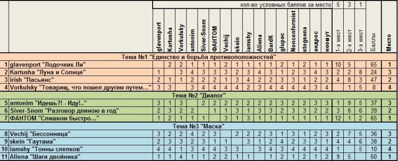 Напомню, что играло 11 стихотворений — пусть многие постоянные участники и прогуляли пропустили игру, но зато у нас новые лица среди конкурсантов и судей — iamshy и BardK, а Vorkulsky, который судил несколько конкурсов в прошлом году, вернулся к нам в качестве автора. Особой борьбы — во всяком случае, за первые места — не получилось, хотя я на нее и надеялась. Впрочем, от души посоревновались между собой догоняющие — вторые-третьи места внутри номинаций распределялись чуть ли не фотофинишем.