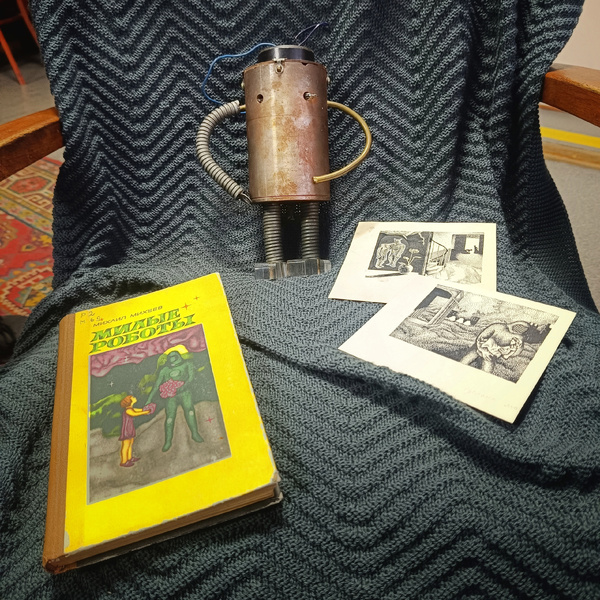 Робот, которого собственноручно смастерил писатель Михеев и его книга "Милые роботы" (1972). Фото из группы ВК "Сквер им. М. П. Михеева".