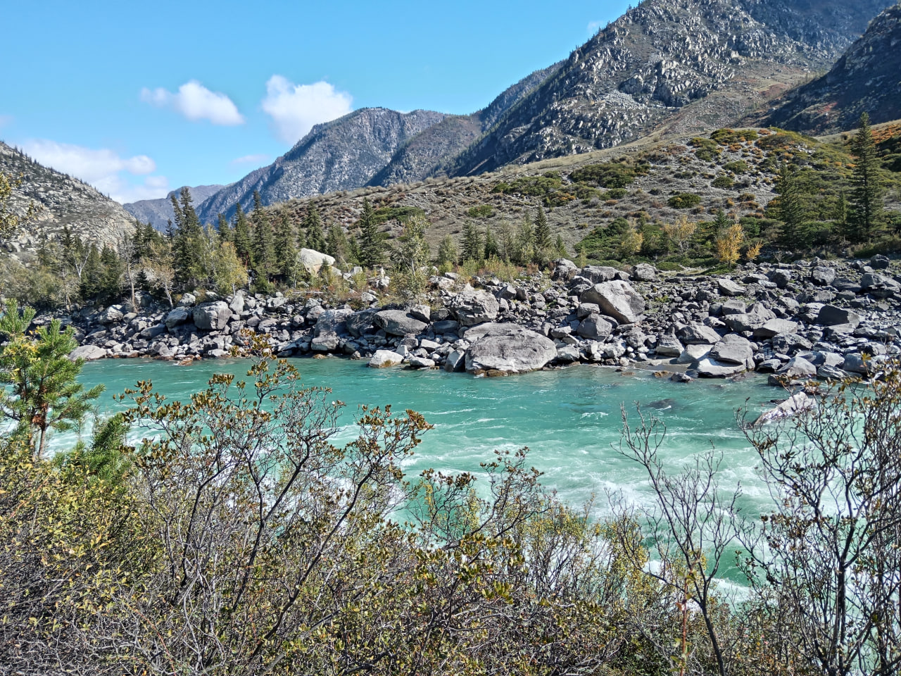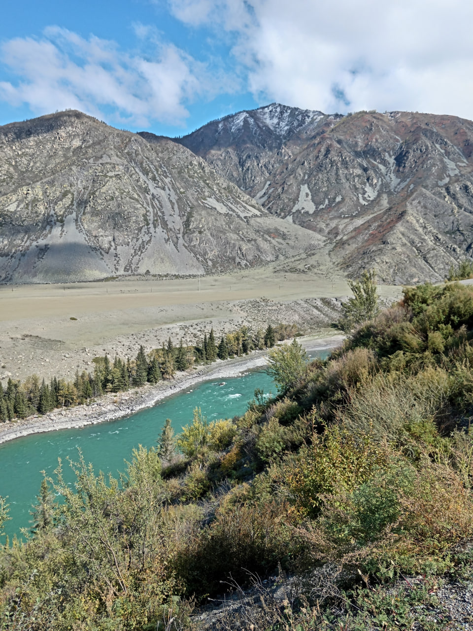 Долго ждала и предвкушала, и это свершилось. Состоялось потрясающее и феерическое путешествие на Алтай. И это было верно выбранное время для поездки — сухо, ослепительно бирюзовый цвет вод реки Катунь и Чуи, буйство красок в предгорьях белоснежных хребтов, ясное синее небо, отсутствие клещей. Сказочно и эпично. Путешествие было длинным и сложным, Алтай — только треть моих насыщенных дорожных приключений, но эта треть безусловно великолепна. Из 27-градусной московской жары я прилетела в барнаульские плюс 6. Было сурово. Но пришлось привыкать. На Алтае перепады температур оказались весьма динамичными. Добравшись до Горно-Алтайска, я увидела, наконец, её — царицу Алтая. Река Катунь прекрасна.