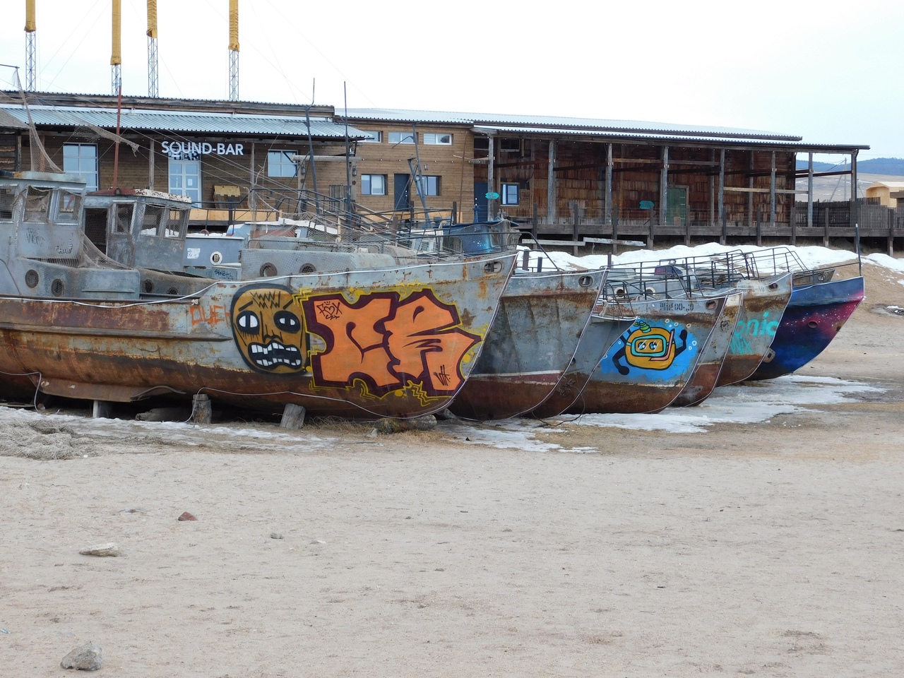 Далее я направилась в п.Хужир на остров Ольхон, где меня радушно встречали хозяева и персонал гостиницы "Лада". Вокруг сосны, чудесный воздух и панорамные виды с гостевого домика на Байкал. Вечером мы с хозяйкой гостиницы пошли изучать остров. На пристани рядом с арт-отелем обнаружили очень любопытные арт-объекты.