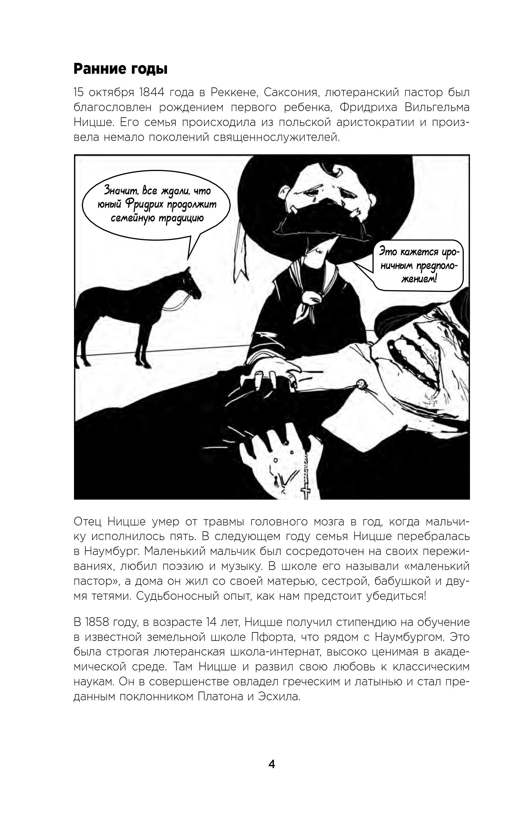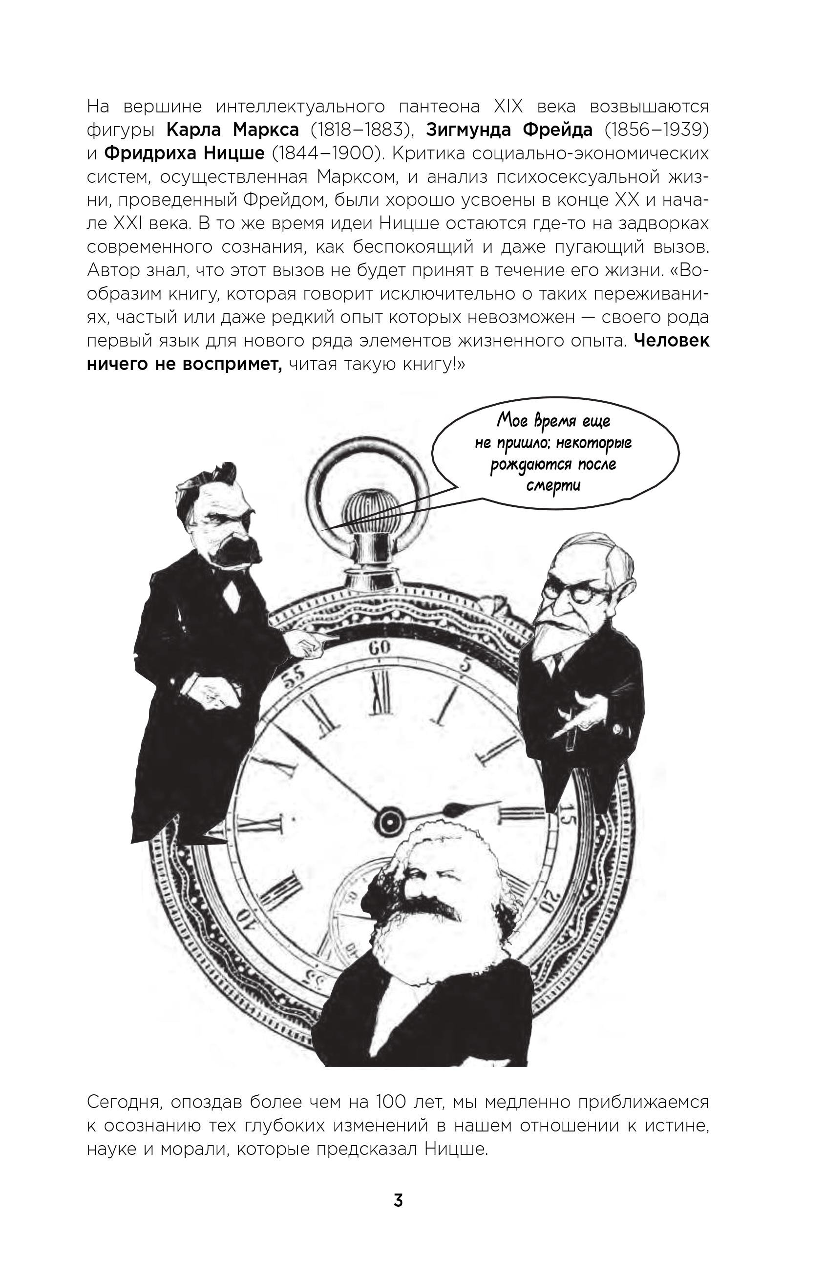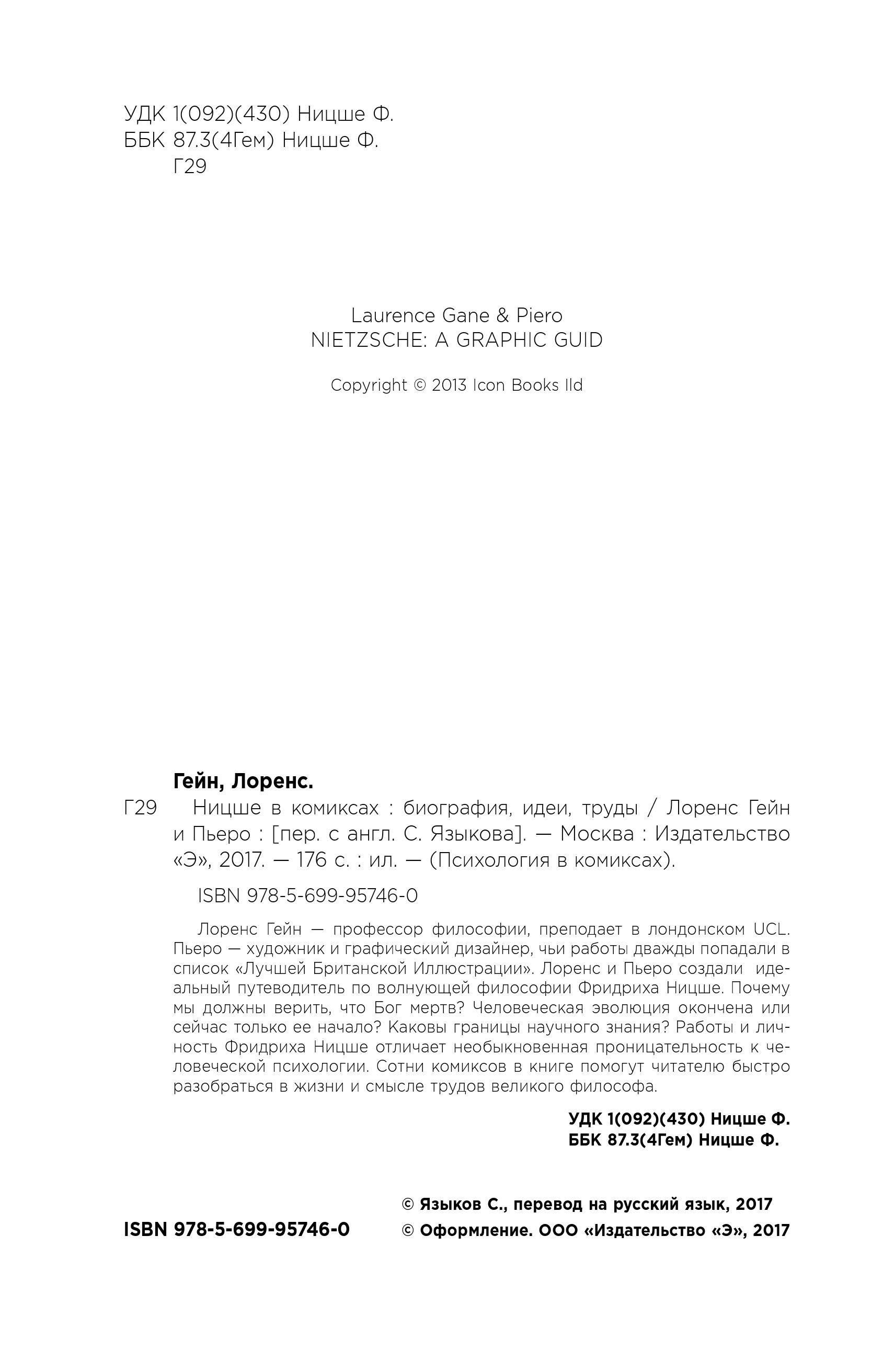 Лоренс Гейн — профессор философии, преподает в лондонском UCL. Пьеро — художник и графический дизайнер, чьи работы дважды попадали в список "Лучшей Британской Иллюстрации". Лоренс и Пьеро создали идеальный путеводитель по волнующей философии Фридриха Ницше. Почему мы должны верить, что Бог мертв? Человеческая эволюция окончена или сейчас только ее начало? Каковы границы научного знания? Работы и личность Фридриха Ницше отличает необыкновенная проницательность к человеческой психологии. Сотни комиксов в книге помогут читателю быстро разобраться в жизни и смысле трудов великого философа.