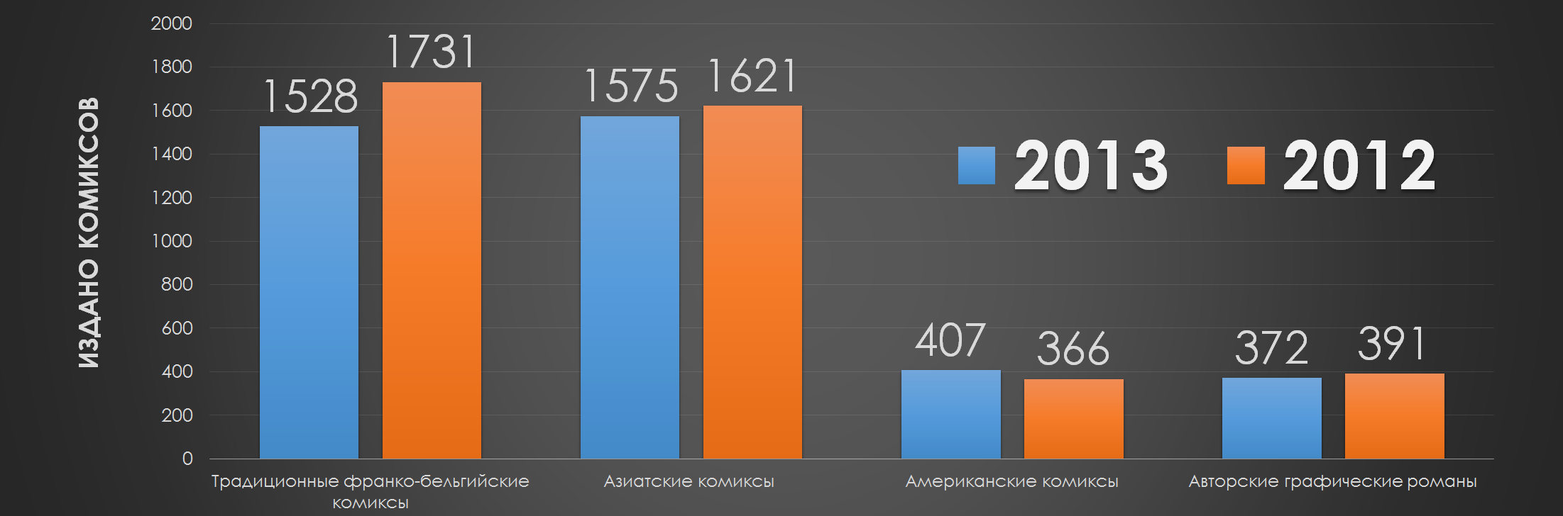 — Авторские графические романы и книги (авангардные и прочие специфические произведения) также в состоянии упадка, только 372 нетипичных альбома выпущенно в 2013 году (в 2012 году их было 391).
