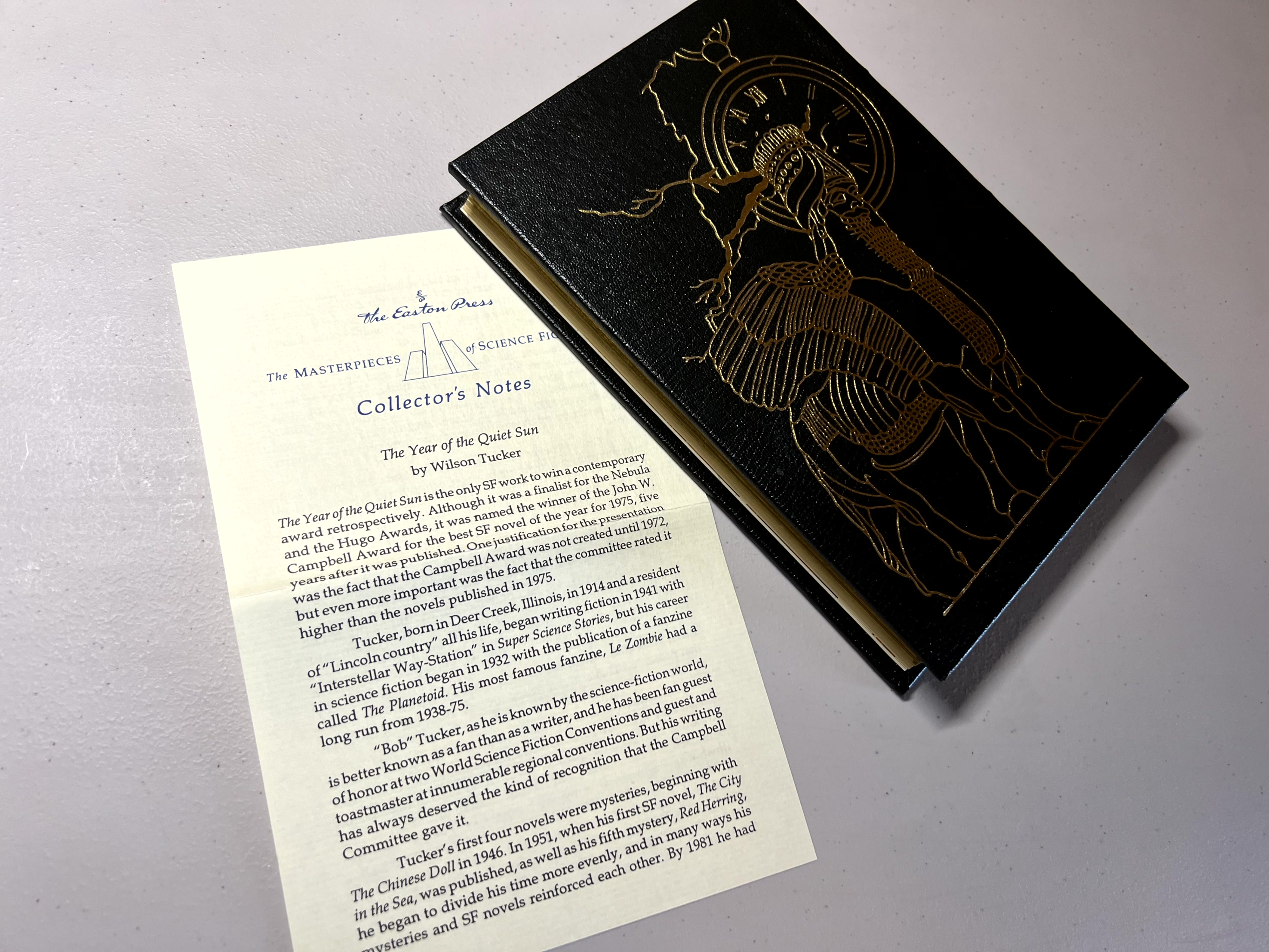 Артур Уилсон Такер (род. в 1914 г.) — второстепенный американский писатель-фантаст, который, как правило, специализировался на рассказах о путешествиях во времени. Один из его самых запоминающихся романов — "Охотники за Линкольном" (1958), о людях будущего, которые отправляются в середину XIX века в поисках Авраама Линкольна. В отличие от этой книги, роман "Год спокойного солнца" посвящен исследованию самого ближайшего будущего с помощью машины времени. История начинается в 1970-х годах. Невольный герой, Брайан Чейни, является экспертом по древней Палестине и автором книги под названием «Из пещер Кумрана: прошлое, настоящее и будущее». Его нанимает красивая молодая женщина Катрина фон Хайз, которая работает в Бюро стандартов США. Они должны принять участие в изучении 2000 года, физическом обследовании с использованием недавно изобретенного и сверхсекретного транспортного средства для перемещения во времени.