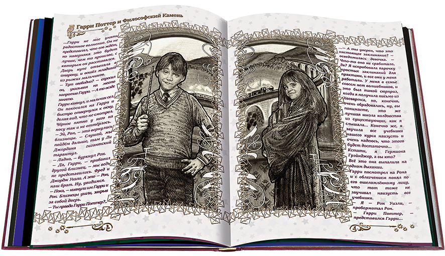 Это совершенно уникальное издание, отлично подходящее для быстрого перехода в режим «настроение ГП». Для любителей саги — это просто вишенка на торте. Книга представляет собой одну сплошную подборку сцен, сплошную галерею с любимыми образами и авторскими цитатами, созданными художниками-аматорами, поклонниками этих удивительных романов. Это не просто графический альбом в привычном понимании подобных изданий. Наш Артбук содержит более двухсот проиллюстрированных сцен ко всем семи томам Поттерианы, всё под одной обложкой, в хронологическом порядке!