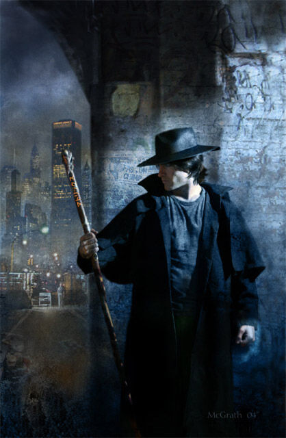 Гарри Дрезден, каким он был в первом романе цикла. Иллюстрация Криса МакГрата с обложки специального издания Storm Front к 20-летию цикла (Grim Oak Press, 2020):