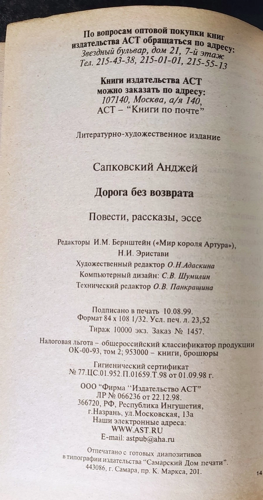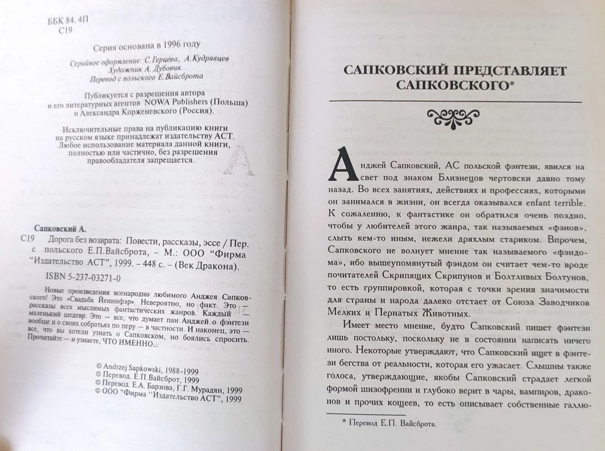 - Анджей Сапковский. Дорога без возврата (рассказ, перевод Е. Вайсброта)), стр. 9-51