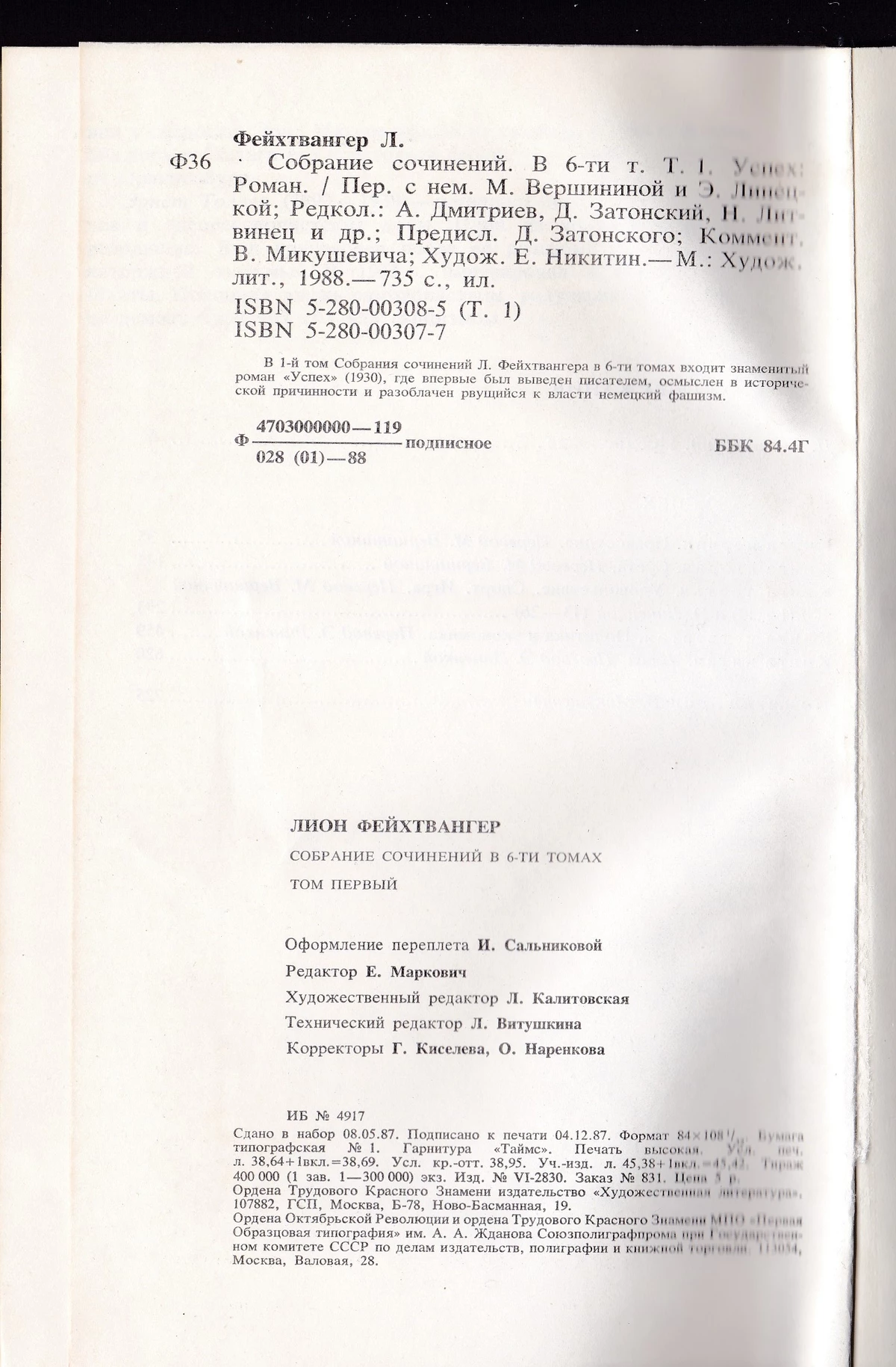 Примечание: Оформление переплета И. Сальниковой. Художественное оформление (?) Е. Никитина. На фронтисписе — фотопортрет Л. Фейхтвангера. Редактор Е. Маркевич. Подписано к печати 04.12.87. Заказ № 831. (1-й завод 1-300000 экз.). Бумага типографская №1.