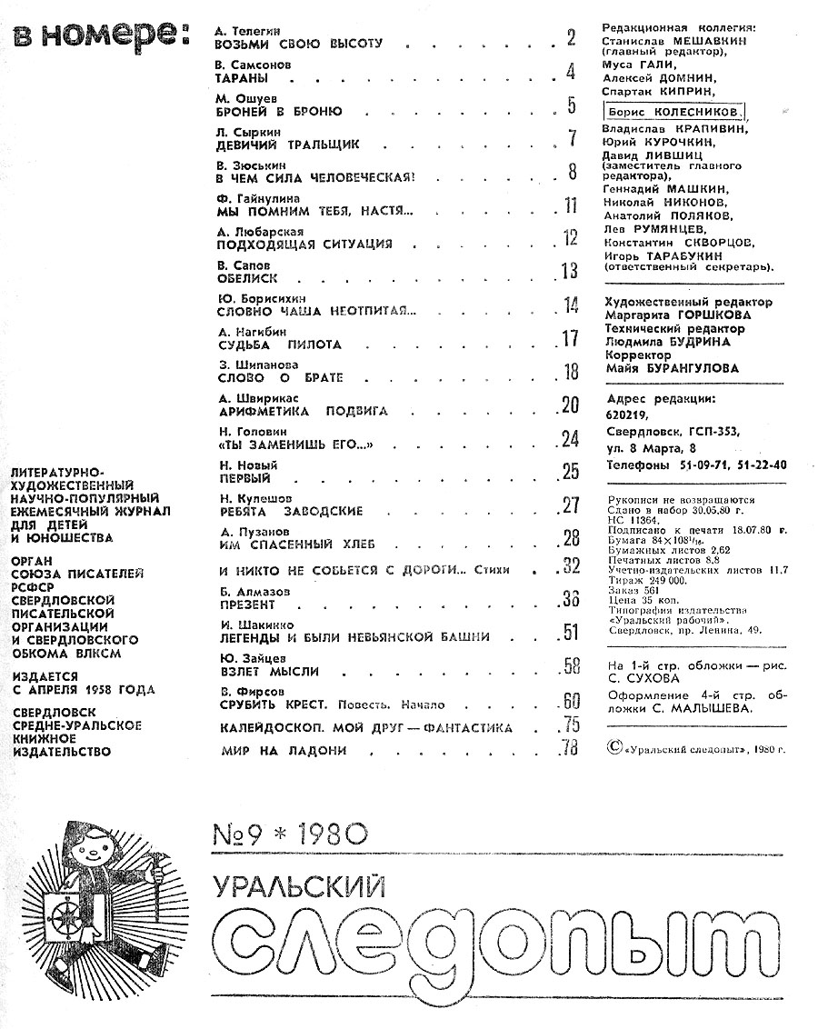 - Владимир Фирсов. Срубить Крест (начало повести, иллюстрации Е. Стерлиговой), стр. 60-74