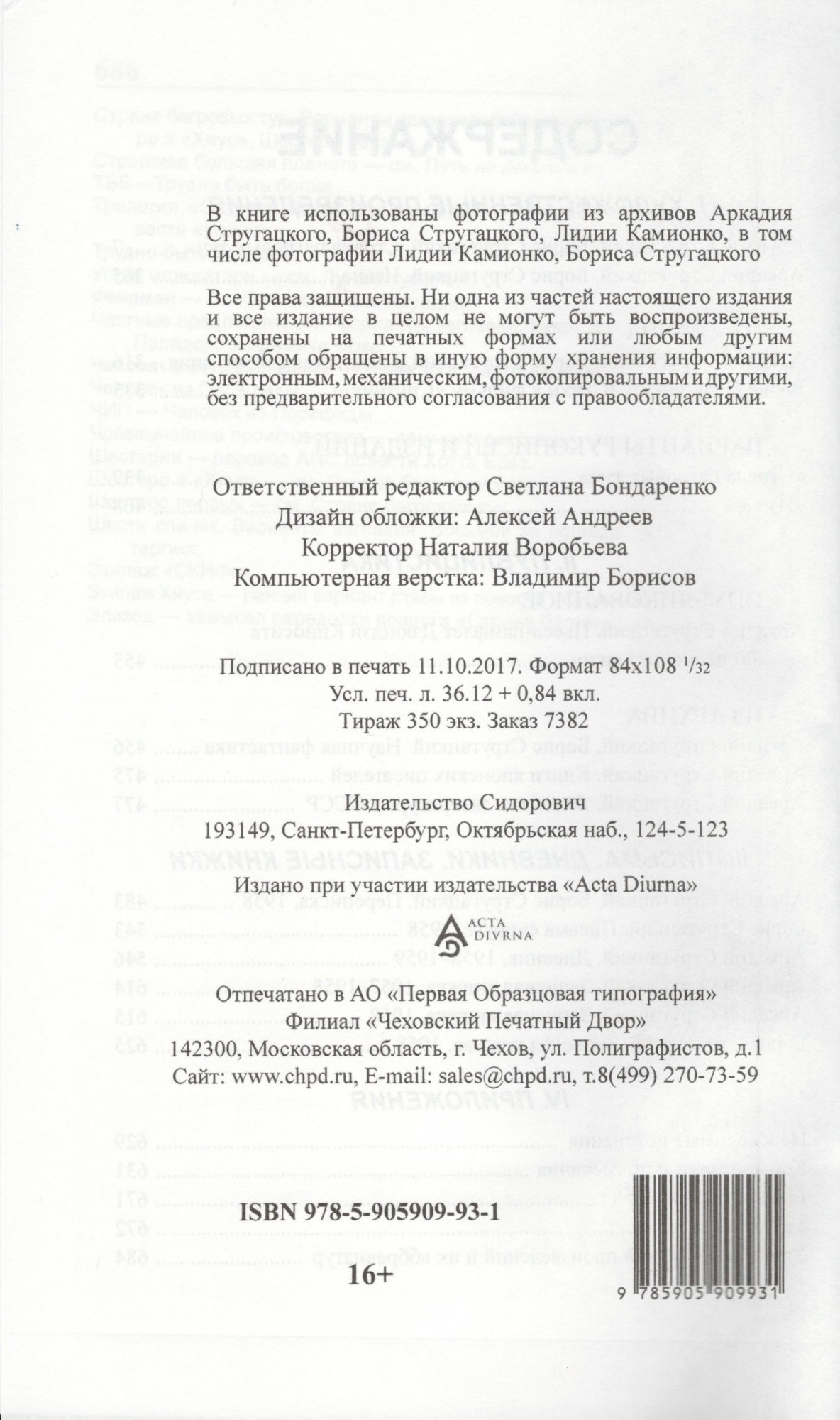 Между стр. 672 и 673 вклейка 16 стр. иллюстраций: 14 страниц — фотографии, 2 страницы — рисунки А. и Б. Стругацких из рукописей и писем.