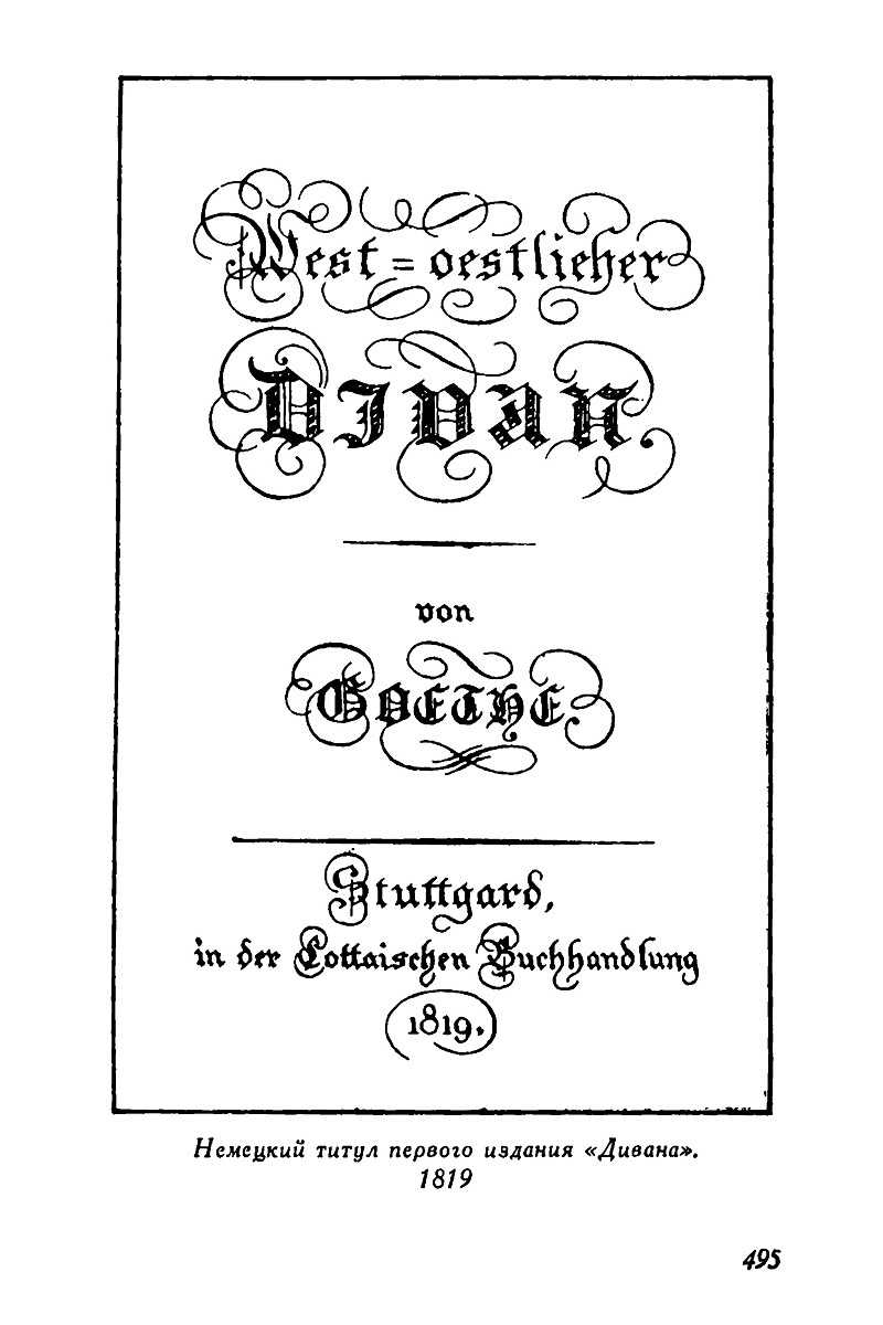 - Иоганн Вольфганг Гёте. [ОБЪЯВЛЕНИЕ О ВЫХОДЕ В СВЕТ «ЗАПАДНО-ВОСТОЧНОГО ДИВАНА»] (перевод А.В. Михайлова), стр. 455